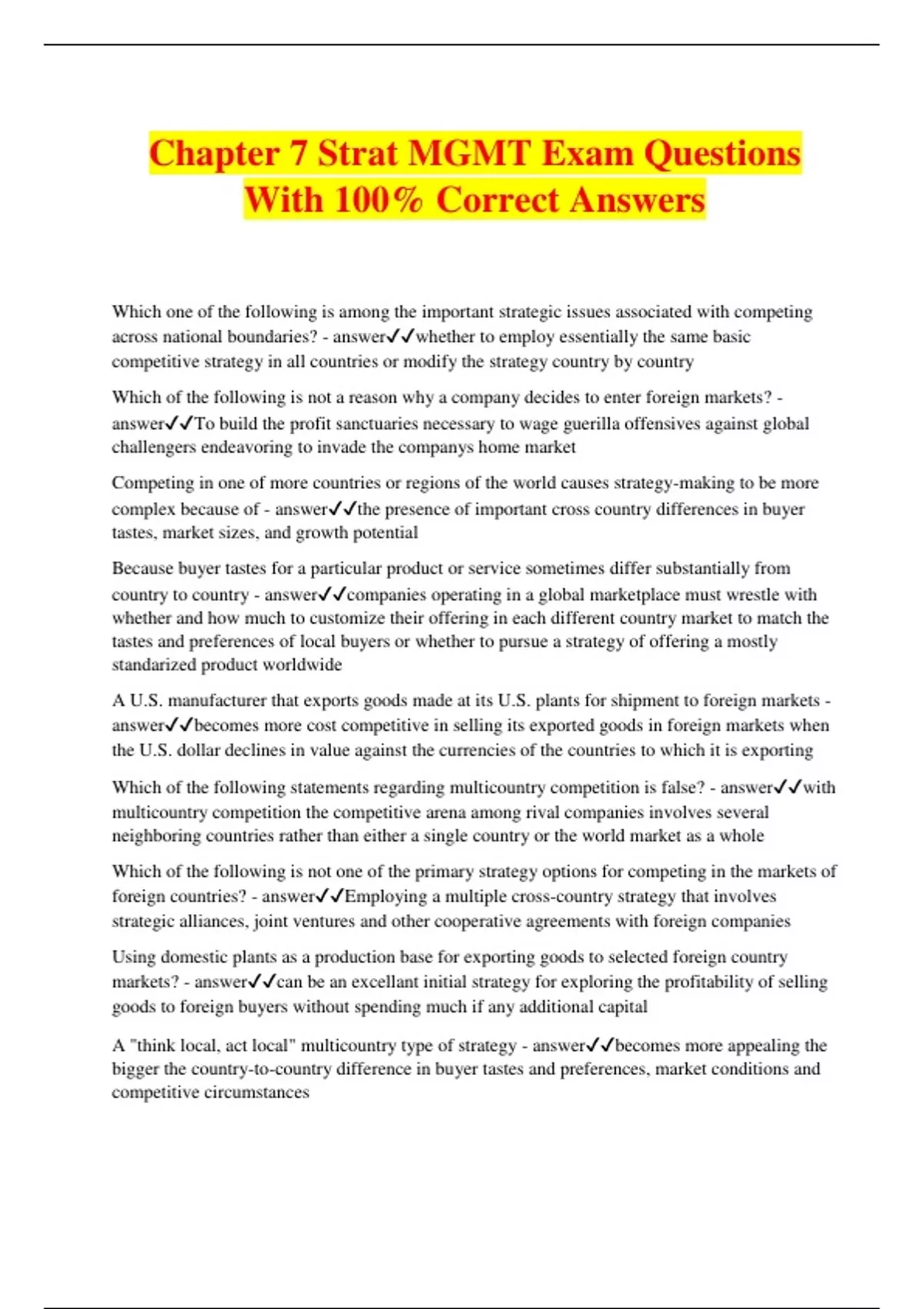 Chapter 7 Strat MGMT Exam Questions With 100% Correct Answers Which one of the following is among the important strategic issues associated with competing across national boundaries? - answerwhether to employ essentially the same basic competitive strategy in all countries or modify the strategy country by country Which of the following is not a reason why a company decides to enter foreign markets? - answerTo build the profit sanctuaries necessary to wage guerilla offensives against global challengers endeavoring to invade the companys home market Competing in one of more countries or regions of the world causes strategy-making to be more complex because of - answerthe presence of important cross country differences in buyer tastes, market sizes, and growth potential Because buyer tastes for a particular product or service sometimes differ substantially from country to country - answercompanies operating in a global marketplace must wrestle with whether and how much to customize their offering in each different country market to match the tastes and preferences of local buyers or whether to pursue a strategy of offering a mostly standarized product worldwide A U.S. manufacturer that exports goods made at its U.S. plants for shipment to foreign markets - answerbecomes more cost competitive in selling its exported goods in foreign markets when the U.S. dollar declines in value against the currencies of the countries to which it is exporting Which of the following statements regarding multicountry competition is false? - answerwith multicountry competition the competitive arena among rival companies involves several neighboring countries rather than either a single country or the world market as a whole Which of the following is not one of the primary strategy options for competing in the markets of foreign countries? - answerEmploying a multiple cross-country strategy that involves strategic alliances, joint ventures and other cooperative agreements with foreign companies Using domestic plants as a production base for exporting goods to selected foreign country markets? - answercan be an excellant initial strategy for exploring the profitability of selling goods to foreign buyers without spending much if any additional capital A "think local, act local" multicountry type of strategy - answerbecomes more appealing the bigger the country-to-country difference in buyer tastes and preferences, market conditions and competitive circumstances