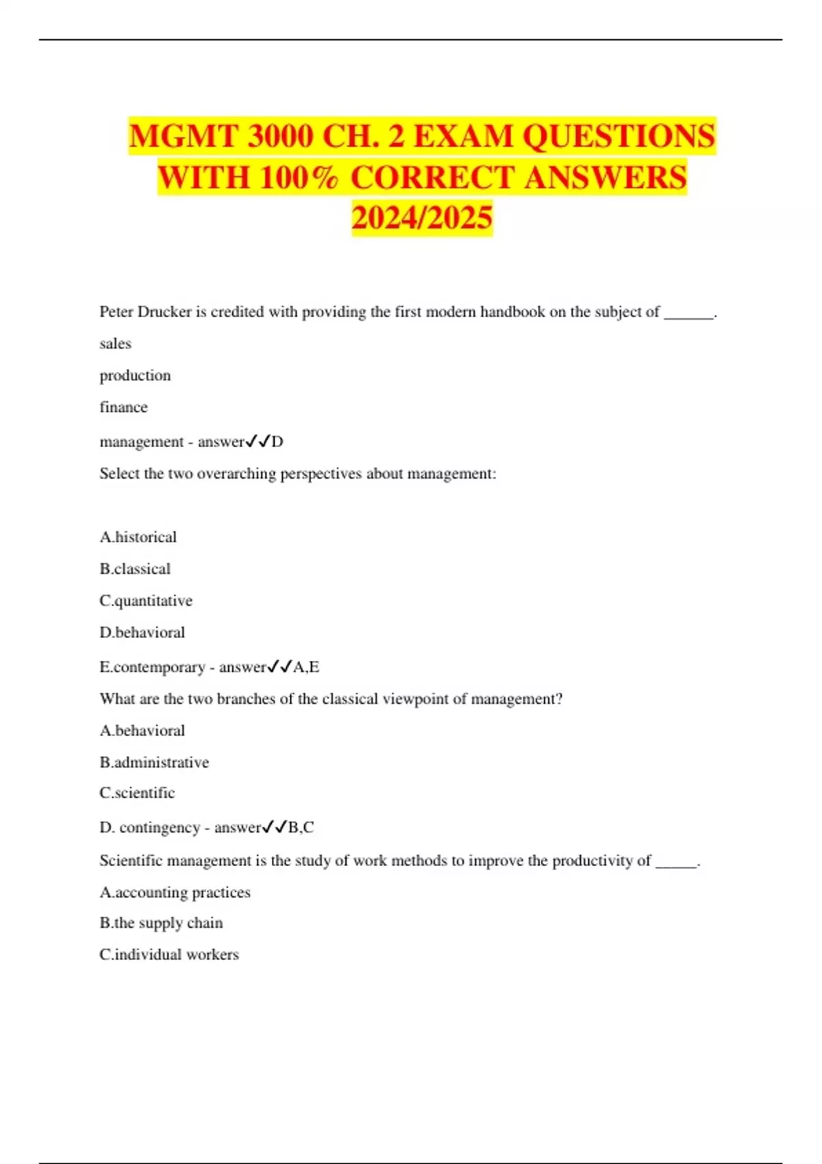 MGMT 3000 CH. 2 EXAM QUESTIONS WITH 100% CORRECT ANSWERS 2024/2025 Peter Drucker is credited with providing the first modern handbook on the subject of ______. sales production finance management - answerD Select the two overarching perspectives about management: A.historical B.classical C.quantitative D.behavioral E.contemporary - answerA,E What are the two branches of the classical viewpoint of management? A.behavioral B.administrative C.scientific D. contingency - answerB,C Scientific management is the study of work methods to improve the productivity of _____. A.accounting practices B.the supply chain C.individual workers D.external vendors - answerC Administrative management is concerned with managing ________. A.the total organization B. company assets C.external vendors D.individual workers - answerA Which of these statements represent ideas that Peter Drucker introduced in his book The Practice of Management? (select all that apply) A. Production costs are a component of sales B.Charismatic leaders are more important than management practices C.Employees should be treated as assets D. A corporation can be thought of as a human community E. Without customers, businesses wouldn't exist - answerC,D,E Charles Clinton Spaulding, one of the pioneering theorists of administrative management, proposed eight _____ of management based in part on his childhood experiences working at his father's fields. A. foundations B. necessities C. considerations D. fundamentals - answerB Two overarching perspectives about management are the ________ perspectives. A. historical and contemporary B. classical and behavioral C. quantitative and qualitative D. systems and contingency - answerA One issue with the classical viewpoint is that it tends to view humans as cogs in a machine, thereby rendering it overly _____. A. amenable B. compassionate C. mechanistic D. sociological - answerC The classical viewpoint of management emphasizes ways to ______. A. enhance employee relations B. manage work more efficiently C. achieve economies of scale D. foster first-mover advantage - answerB