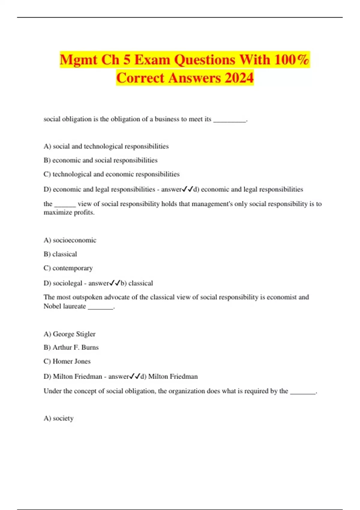 Mgmt Ch 5 Exam Questions With 100% Correct Answers 2024 social obligation is the obligation of a business to meet its _________. A) social and technological responsibilities B) economic and social responsibilities C) technological and economic responsibilities D) economic and legal responsibilities - answerd) economic and legal responsibilities the ______ view of social responsibility holds that management's only social responsibility is to maximize profits. A) socioeconomic B) classical C) contemporary D) sociolegal - answerb) classical The most outspoken advocate of the classical view of social responsibility is economist and Nobel laureate _______. A) George Stigler B) Arthur F. Burns C) Homer Jones D) Milton Friedman - answerd) Milton Friedman Under the concept of social obligation, the organization does what is required by the _______. A) society B) stakeholders C) environment D) law - answerd) law The _____ view is that management's social responsibility goes beyond making profits to include protecting and improving society's welfare. A) sociotechnical B) socioeconomic C) sociolegal D) sociopolitical - answerb) socioeconomic When a firm advertises that it only uses recycled paper products it is _____. A) meeting its social obligation B) meeting its social screening requirements C) being socially responsive D) adopting green management - answerc) being socially responsive A U.S. business that provides on-site childcare facilities for employees is _____. A) being socially responsive B) fulfilling its social obligations C) adopting social screening D) practicing green management - answera) being socially responsive ____ is defined as a business firm's intention, beyond its legal and economic obligations, to do the right and act in ways that are good for society. A) Social obligation B) Social responsibility C) Social screening D) Values-based management - answerb) social responsibility the aspect that differentiates social responsibility from other similar concepts is that it adds a(n) ________. A) ethical imperative B) legal imperative C) political imperative D) technical imperative - answera) ethical imperative In the United States a company that meets federal pollution control standards and does not discriminate in hiring, promotion, and pay is generally meeting its ________. A) social screening requirements B) green management requirements C) social obligation D) social responsibility - answerc) social obligation which of the following examples reflects a socially responsible action by an organization? A) Ford Motor Company became the first automaker to endorse a federal ban on sending text messages while driving. B) Apple has eliminated lead-lined glass monitors from its product line and pioneered reduced- sized packaging that leverages recyclable materials. C) Fed Ex provided the Federal Emergency Management Agency (FEMA) with a radio antenna to set up communications in the immediate aftermath of Hurricane Katrina. D) UPS has a company-wide policy that urges employees to volunteer during natural disasters and other crises. - answerb) apple has eliminated lead-lined glass monitors from its product line and pioneered reduced-sized packaging that leverages recyclable materials according to the _____ argument on social responsibility, businesses should be socially responsible because responsible