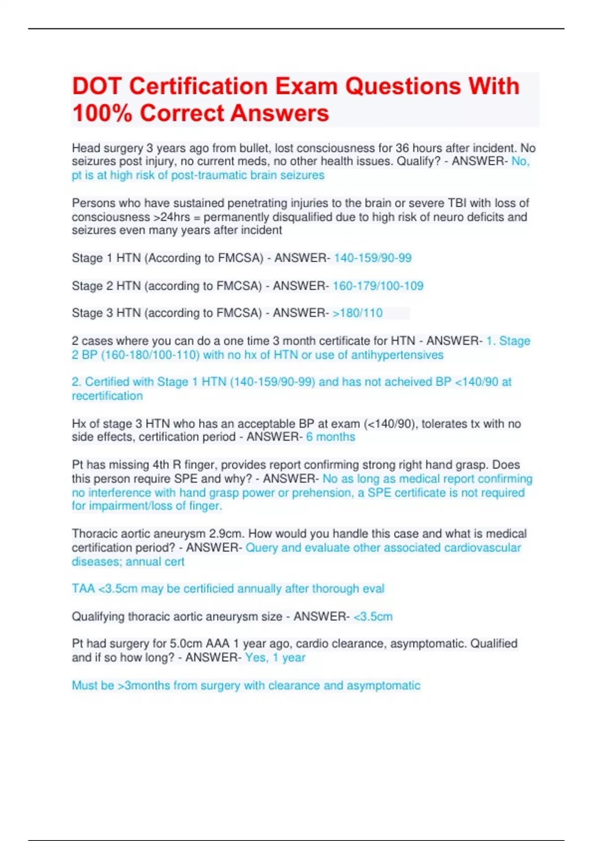 DOT Certification Exam Questions With 100% Correct Answers Head surgery 3 years ago from bullet, lost consciousness for 36 hours after incident. No seizures post injury, no current meds, no other health issues. Qualify? - ANSWER- No, pt is at high risk of post-traumatic brain seizures Persons who have sustained penetrating injuries to the brain or severe TBI with loss of consciousness >24hrs = permanently disqualified due to high risk of neuro deficits and seizures even many years after incident Stage 1 HTN (According to FMCSA) - ANSWER- 140-159/90-99 Stage 2 HTN (according to FMCSA) - ANSWER- 160-179/100-109 Stage 3 HTN (according to FMCSA) - ANSWER- >180/110 2 cases where you can do a one time 3 month certificate for HTN - ANSWER- 1. Stage 2 BP (160-180/100-110) with no hx of HTN or use of antihypertensives 2. Certified with Stage 1 HTN (140-159/90-99) and has not acheived BP <140/90 at recertification Hx of stage 3 HTN who has an acceptable BP at exam (<140/90), tolerates tx with no side effects, certification period - ANSWER- 6 months Pt has missing 4th R finger, provides report confirming strong right hand grasp. Does this person require SPE and why? - ANSWER- No as long as medical report confirming no interference with hand grasp power or prehension, a SPE certificate is not required for impairment/loss of finger. Thoracic aortic aneurysm 2.9cm. How would you handle this case and what is medical certification period? - ANSWER- Query and evaluate other associated cardiovascular diseases; annual cert TAA <3.5cm may be certificied annually after thorough eval Qualifying thoracic aortic aneurysm size - ANSWER- <3.5cm Pt had surgery for 5.0cm AAA 1 year ago, cardio clearance, asymptomatic. Qualified and if so how long? - ANSWER- Yes, 1 year Must be >3months from surgery with clearance and asymptomatic Which of the following neuro healthy history is IMMEDIATELY disqualifying? a. transient global amnesia b. transient sleep disorders causing excessive daytime somnolence c. number of unprovoked seizures within period of 6 years d. all the above - ANSWER- C. hx of epilepsy is disqualifying Prominent risk factors for OSA - ANSWER- BMI >28 Small jaw Large neck >17in males, >15.5in females Small area Family hx Pt with DM previously treated with oral meds and now required insulin must establish a control of hypoglycemia or hyperglycemia for a period of: - ANSWER- 1 month Minimum period required to demonstrate insulin stability following the first episode of hypoglycemia - ANSWER- 1 year What annual exams required for Pt certified under the Federal Diabetes Exemption Program for 2 years? a. vision, kidney, resp b. hearing, neuro, resp c. vision, neuro, cardio d. hearing, resp, cardio - ANSWER- c. vision, neuro, cardio 44yo male: Max cert period with pt hx of angina pectoris, cardio report 4 months before indiciating that he is asymptomatic, tolerating meds, achieved 110bpm max on ETT? a. 1 year b. 2 years c. 6 mos d. not to be certified - ANSWER- Medical report is >3mos and his ETT is abnormal as he achieved <65% intensity for a person his age (114bpm = 220 - age x 0.65) Any hx of angina is disqualified if symptomatic, changes in angina in the past 3 months, abnormal ETT, ischemic changes on rest ECG and intolerance to meds Which of the following should happen if a driver is cited for a moving traffic violation? a. lose certification b. undergo psych eval c. drug and/or alcohol testing d. none of the above - ANSWER- c. drug and ETOH testing