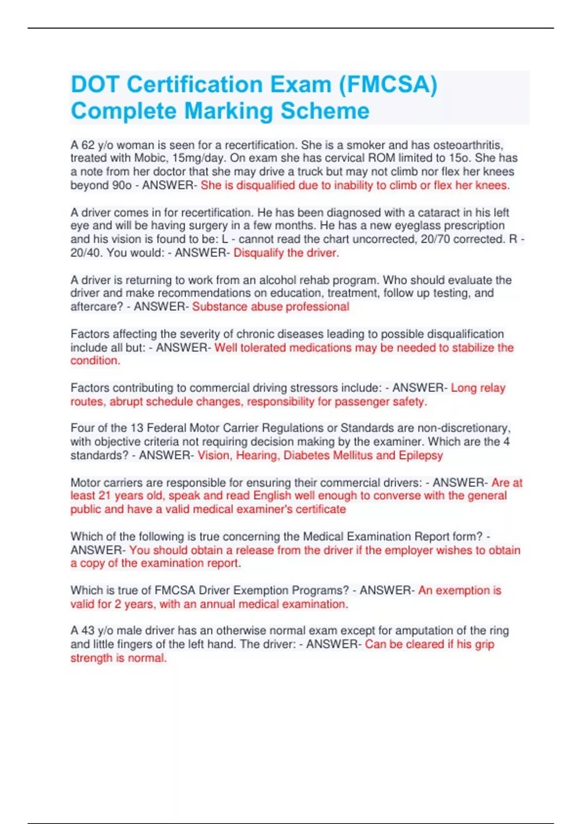 DOT Certification Exam (FMCSA) Complete Marking Scheme