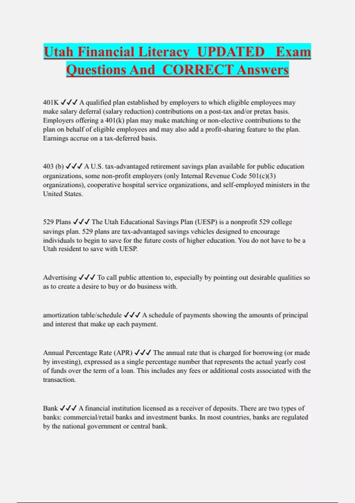 Utah Financial Literacy UPDATED Exam Questions And CORRECT Answers