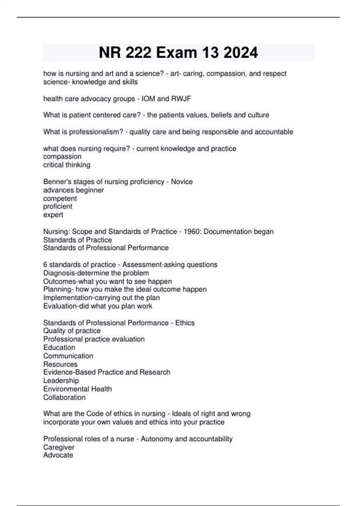 how is nursing and art and a science? - art- caring, compassion, and respect science- knowledge and skills health care advocacy groups - IOM and RWJF What is patient centered care? - the patients values, beliefs and culture What is professionalism? - quality care and being responsible and accountable what does nursing require? - current knowledge and practice compassion critical thinking Benner's stages of nursing proficiency - Novice advances beginner competent proficient expert Nursing: Scope and Standards of Practice - 1960: Documentation began Standards of Practice Standards of Professional Performance 6 standards of practice - Assessment-asking questions Diagnosis-determine the problem Outcomes-what you want to see happen Planning- how you make the ideal outcome happen Implementation-carrying out the plan Evaluation-did what you plan work Standards of Professional Performance - Ethics Quality of practice Professional practice evaluation Education Communication Resources Evidence-Based Practice and Research Leadership Environmental Health Collaboration What are the Code of ethics in nursing - Ideals of right and wrong incorporate your own values and ethics into your practice Professional roles of a nurse - Autonomy and accountability Caregiver Advocate Educator