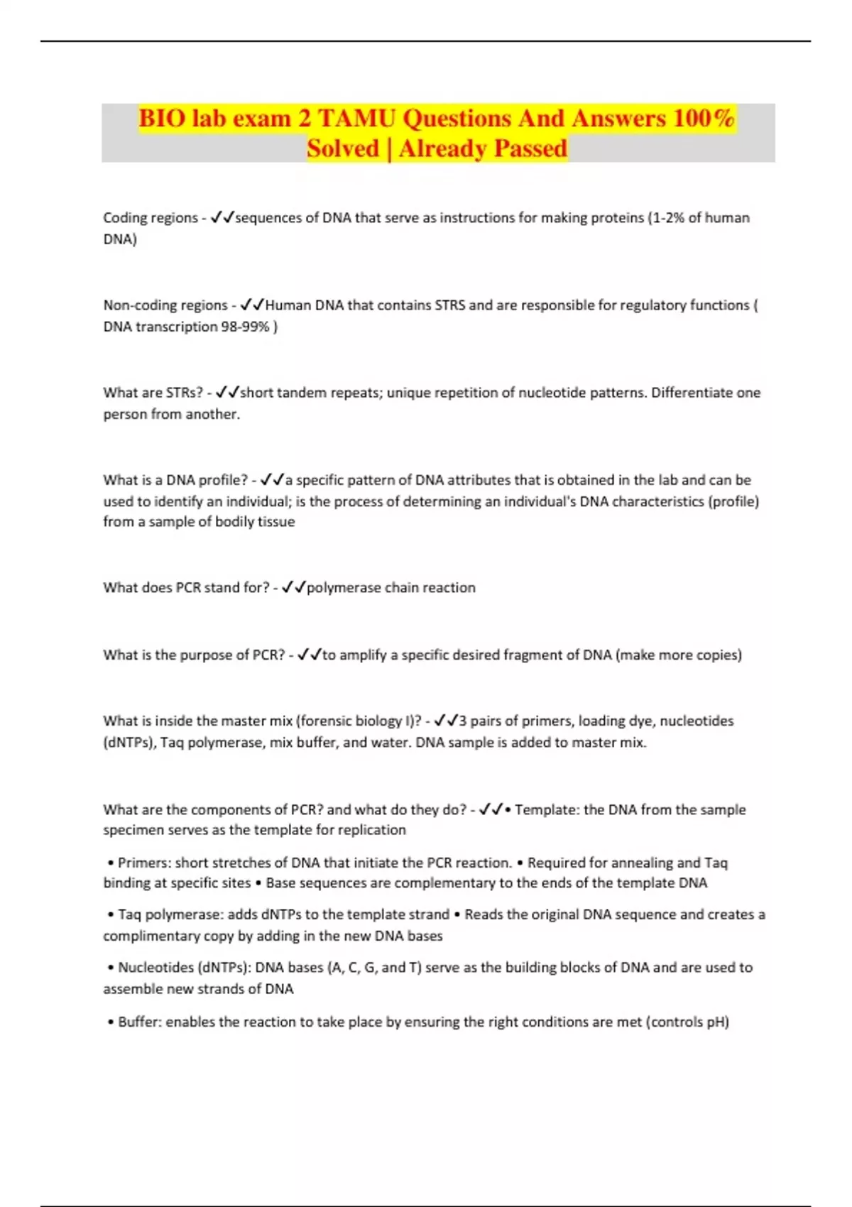 Coding regions - sequences of DNA that serve as instructions for making proteins (1-2% of human DNA) Non-coding regions - Human DNA that contains STRS and are responsible for regulatory functions ( DNA transcription 98-99% ) What are STRs? - short tandem repeats; unique repetition of nucleotide patterns. Differentiate one person from another. What is a DNA profile? - a specific pattern of DNA attributes that is obtained in the lab and can be used to identify an individual; is the process of determining an individual's DNA characteristics (profile) from a sample of bodily tissue What does PCR stand for? - polymerase chain reaction What is the purpose of PCR? - to amplify a specific desired fragment of DNA (make more copies) What is inside the master mix (forensic biology I)? - 3 pairs of primers, loading dye, nucleotides (dNTPs), Taq polymerase, mix buffer, and water. DNA sample is added to master mix.