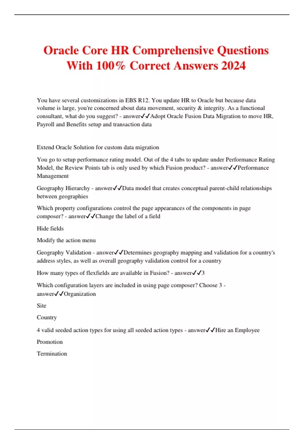Oracle Core HR Comprehensive Questions With 100% Correct Answers 2024 You have several customizations in EBS R12. You update HR to Oracle but because data volume is large, you're concerned about data movement, security & integrity. As a functional consultant, what do you suggest? - answerAdopt Oracle Fusion Data Migration to move HR, Payroll and Benefits setup and transaction data Extend Oracle Solution for custom data migration You go to setup performance rating model. Out of the 4 tabs to update under Performance Rating Model, the Review Points tab is only used by which Fusion product? - answerPerformance Management Geography Hierarchy - answerData model that creates conceptual parent-child relationships between geographies Which property configurations control the page appearances of the components in page composer? - answerChange the label of a field Hide fields Modify the action menu Geography Validation - answerDetermines geography mapping and validation for a country's address styles, as well as overall geography validation control for a country How many types of flexfields are available in Fusion? - answer3 Which configuration layers are included in using page composer? Choose 3 - answerOrganization Site Country 4 valid seeded action types for using all seeded action types - answerHire an Employee Promotion Termination Leave of Absence Individual legal entities... - answerOwn assets of the enterprise Record sales and ay taxes Pay employee payroll wages Make purchases and incur expenses Perform other transactions Geography Structure - answerHierarchical grouping of geography types for a country 4 business subprocesses offered under Workforce Deployment - answerManage Absence Manage Social Networking Manage Workforce Profiles Manage Workforce Lifecycles Identify the correct sequence to setup: Enterprise Business Unit Legal Entity Reference Set Legislative Data Group - answerEnterprise Legal Entity Business Unit Reference Sets Legislative Data Group 2 model profiles for Workforce Structures - answerJobs Positions 3 benefits of Oracle Lightweight Directory Access Protocol System LDAP? - answerEnforce principle of least privilege Segregate duties to be more rigorously enforced Allow principle of assured revocation to be more rigorously enforced 2 lists of grades should be in 2 separate business units, but you notice in testing the list of grades between the 2 is not per requirement. What went wrong? - answerThe grade sets of the 2 business units have been interchanged You want to track previous employment information including employer names, dates of employment and job description. What should you do? - answerCreate free form content type without content item 3 data sets you can compare 2 jobs on? - answerCompetencies Assignment Potential 2 options with editable values on the assignment? - answer1. Assignment Number, Assignment Name 2. Assignment Status, Assignment Projected End Date While updating employee records, which fields are date effective? - answerFirst Name Phone Number Assignment Details What is freeform content type? - answerDo not contain relationships and do not contain properties until you add them to a profile type 3 typical security tasks performed using Oracle Authorization Policy Manager? - answerView full role hierarchies and manage duty role hierarchies Manage job and abstract (enterprise) roles Viewing data, job, and role security policies and permission grants T/F The Request a Position transaction allows managers to request changing to an existing position - answerFalse When creating a checklist task you must assign a task performer. What values are supported? - answerWorker Manager Initiator User Area of Responsibility T/F The onboarding enterprise checklists can be automatically allocated to workers, managers and administrators, but standard checklists must be manually allocated. - answerFalse