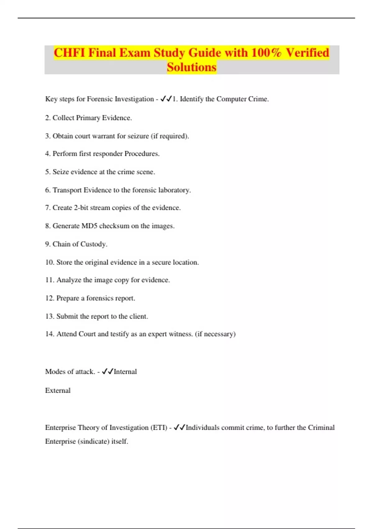 Key steps for Forensic Investigation - 1. Identify the Computer Crime. 2. Collect Primary Evidence. 3. Obtain court warrant for seizure (if required). 4. Perform first responder Procedures. 5. Seize evidence at the crime scene. 6. Transport Evidence to the forensic laboratory. 7. Create 2-bit stream copies of the evidence. 8. Generate MD5 checksum on the images. 9. Chain of Custody. 10. Store the original evidence in a secure location. 11. Analyze the image copy for evidence. 12. Prepare a forensics report. 13. Submit the report to the client. 14. Attend Court and testify as an expert witness. (if necessary) Modes of attack. - Internal External Enterprise Theory of Investigation (ETI) - Individuals commit crime, to further the Criminal Enterprise (sindicate) itself.Law Enforcement targets and dismantles the entire criminal enterpr
