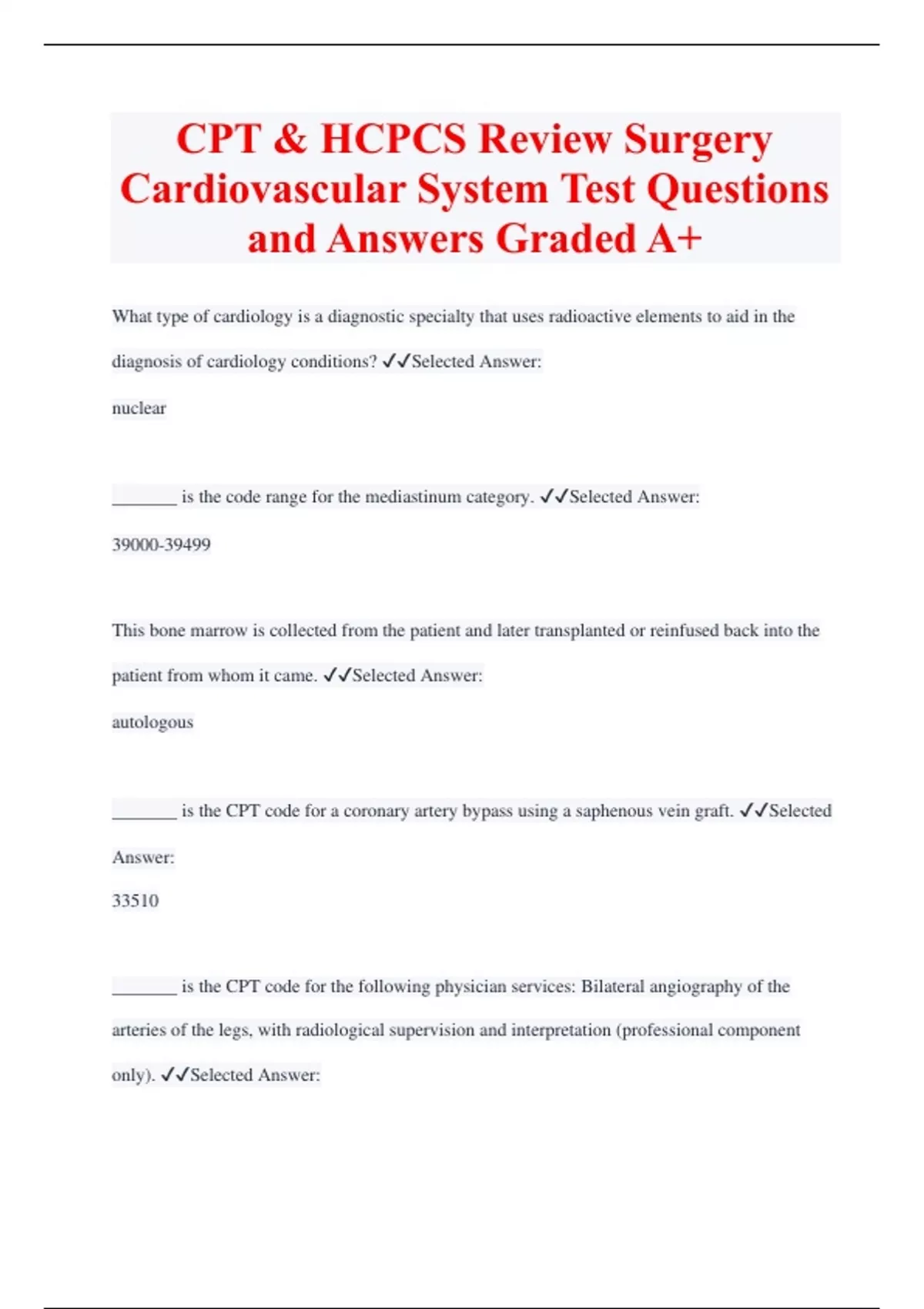 CPT & HCPCS Review Surgery Cardiovascular System Test Questions and Answers Graded A+ What type of cardiology is a diagnostic specialty that uses radioactive elements to aid in the diagnosis of cardiology conditions? Selected Answer: nuclear _______ is the code range for the mediastinum category. Selected Answer: This bone marrow is collected from the patient and later transplanted or reinfused back into the patient from whom it came. Selected Answer: autologous _______ is the CPT code for a coronary artery bypass using a saphenous vein graft. Selected Answer: 33510