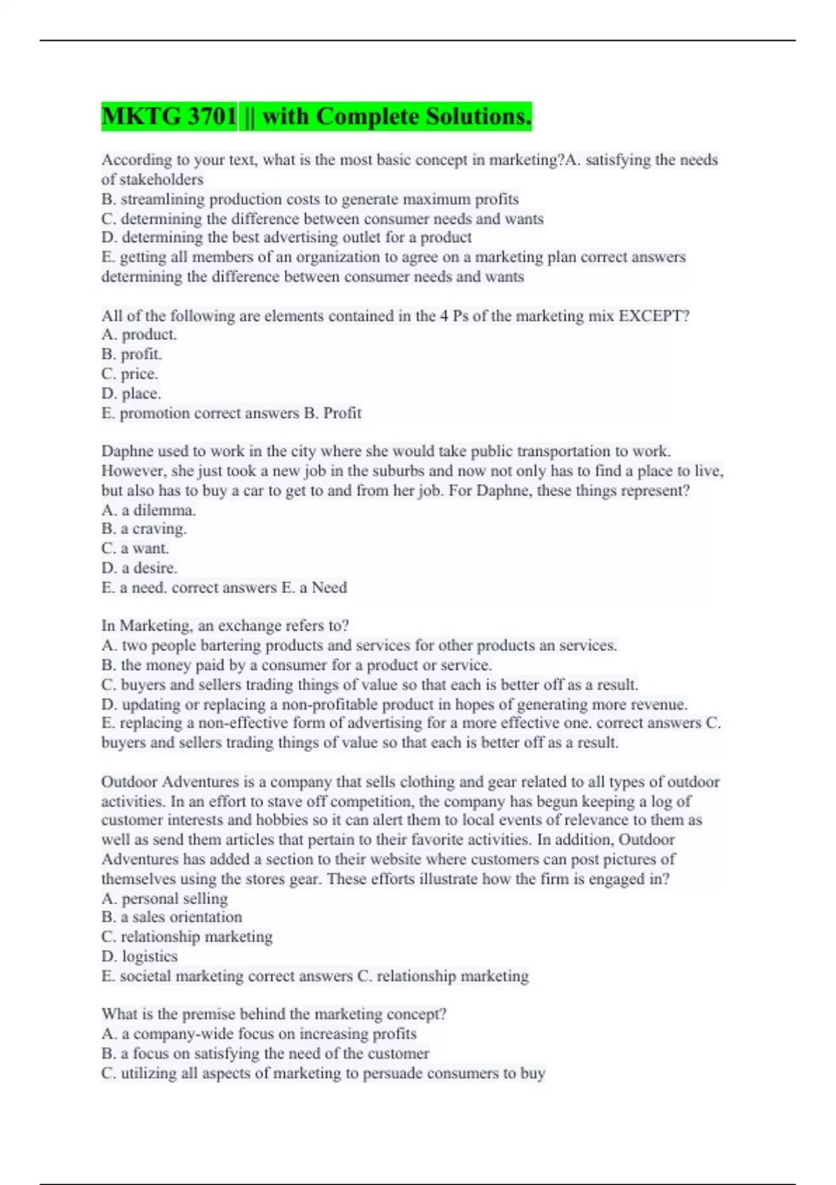 According to your text, what is the most basic concept in marketing?A. satisfying the needs of stakeholders B. streamlining production costs to generate maximum profits C. determining the difference between consumer needs and wants D. determining the best advertising outlet for a product E. getting all members of an organization to agree on a marketing plan correct answers determining the difference between consumer needs and wants All of the following are elements contained in the 4 Ps of the marketing mix EXCEPT? A. product. B. profit. C. price. D. place. E. promotion correct answers B. Profit Daphne used to work in the city where she would take public transportation to work. However, she just took a new job in the suburbs and now not only has to find a place to live, but also has to buy a car to get to and from her job. For Daphne, these things represent? A. a dilemma. B. a craving. C. a want. D. a desire. E. a need. correct answers E. a Need In Marketing, an exchange refers to? A. two people bartering products and services for other products an services. B. the money paid by a consumer for a product or service. C. buyers and sellers trading things of value so that each is better off as a result. D. updating or replacing a non-profitable product in hopes of generating more revenue. E. replacing a non-effective form of advertising for a more effective one. correct answers C. buyers and sellers trading things of value so that each is better off as a result. Outdoor Adventures is a company that sells clothing and gear related to all types of outdoor activities. In an effort to stave off competition, the company has begun keeping a log of customer interests and hobbies so it can alert them to local events of relevance to them as well as send them articles that pertain to their favorite activities. In addition, Outdoor Adventures has added a section to their website where customers can post pictures of themselves using the stores gear. These efforts illustrate how the firm is engaged in? A. personal selling B. a sales orientation C. relationship marketing D. logistics E. societal marketing correct answers C. relationship marketing What is the premise behind the marketing concept? A. a company-wide focus on increasing profits B. a focus on satisfying the need of the customer C. utilizing all aspects of marketing to persuade consumers to buy