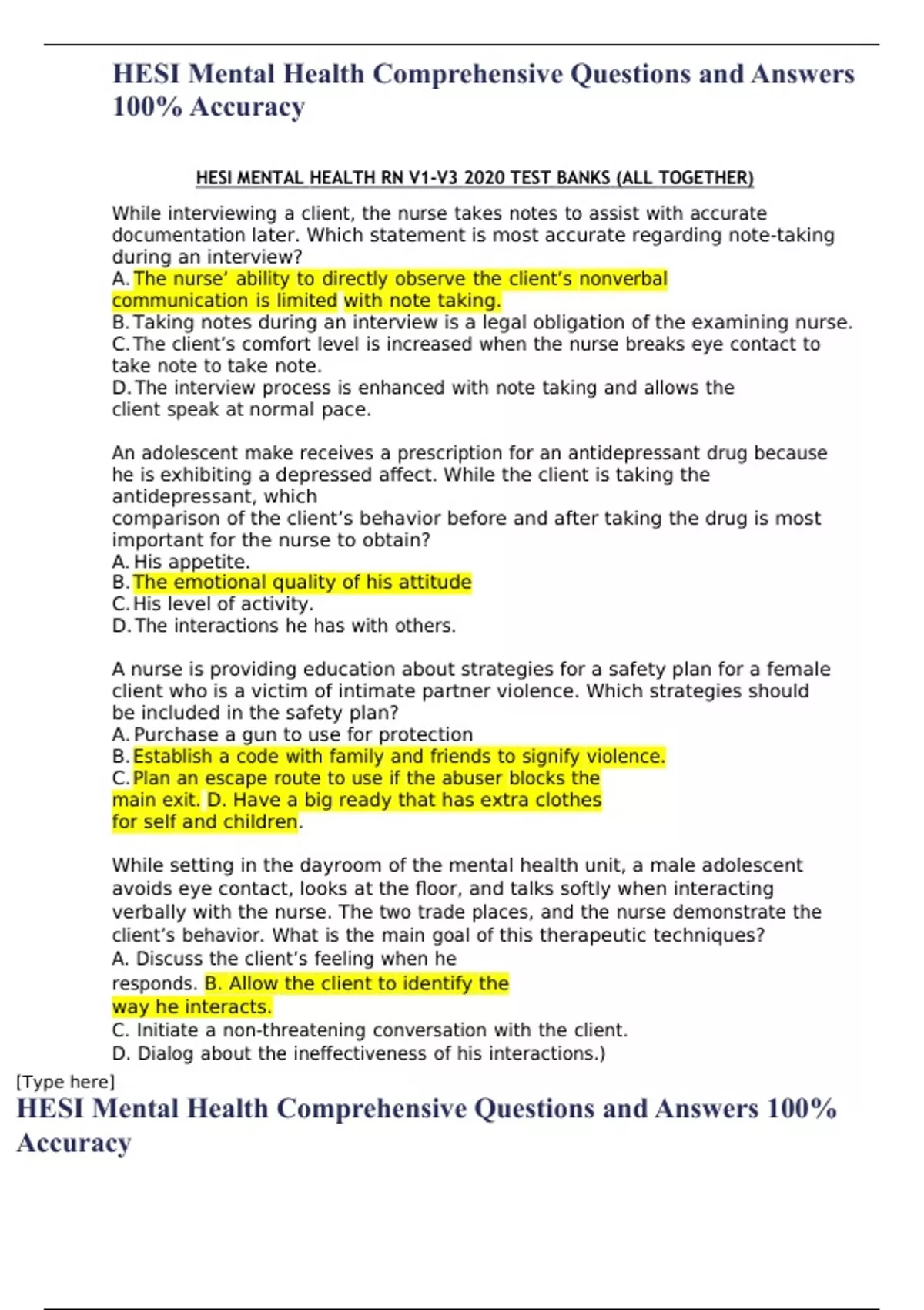 HESI Mental Health Comprehensive Questions and Answers 100% Accuracy