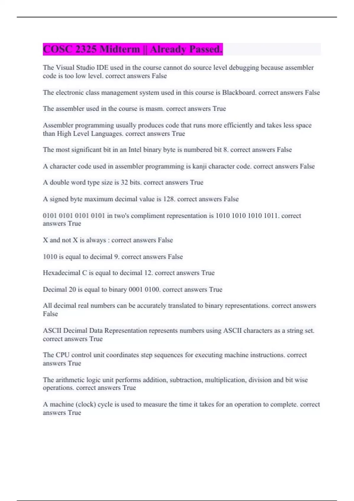 The Visual Studio IDE used in the course cannot do source level debugging because assembler code is too low level. correct answers False The electronic class management system used in this course is Blackboard. correct answers False The assembler used in the course is masm. correct answers True Assembler programming usually produces code that runs more efficiently and takes less space than High Level Languages. correct answers True The most significant bit in an Intel binary byte is numbered bit 8. correct answers False A character code used in assembler programming is kanji character code. correct answers False A double word type size is 32 bits. correct answers True A signed byte maximum decimal value is 128. correct answers False in two's compliment representation is . correct answers True X and not X is always : correct answers False 1010 is equal to decimal 9. correct answers False Hexadecimal C is equal to decimal 12. correct answers True Decimal 20 is equal to binary . correct answers True All decimal real numbers can be accurately translated to binary representations. correct answers False ASCII Decimal Data Representation represents numbers using ASCII characters as a string set. correct answers True The CPU control unit coordinates step sequences for executing machine instructions. correct answers True The arithmetic logic unit performs addition, subtraction, multiplication, division and bit wise operations. correct answers True A machine (clock) cycle is used to measure the time it takes for an operation to complete. correct answers True