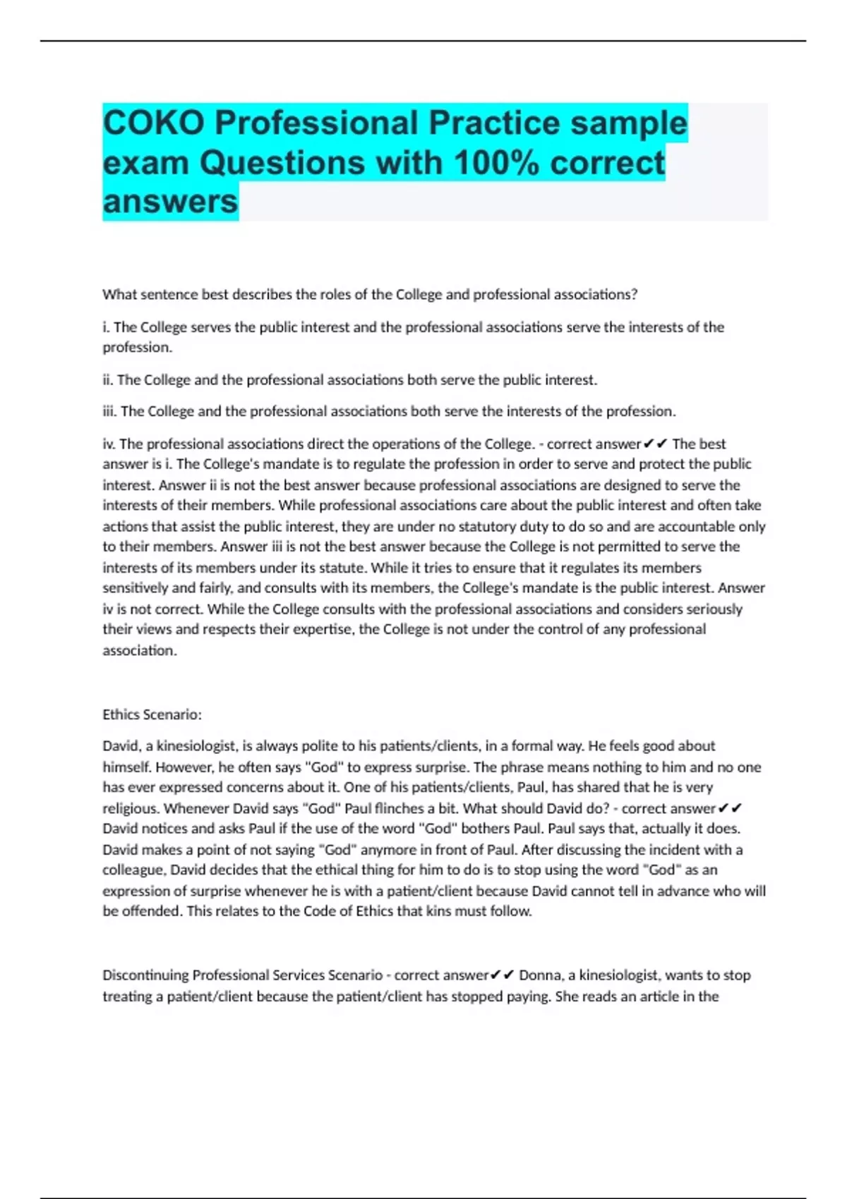COKO Professional Practice sample exam Questions with 100% correct answers