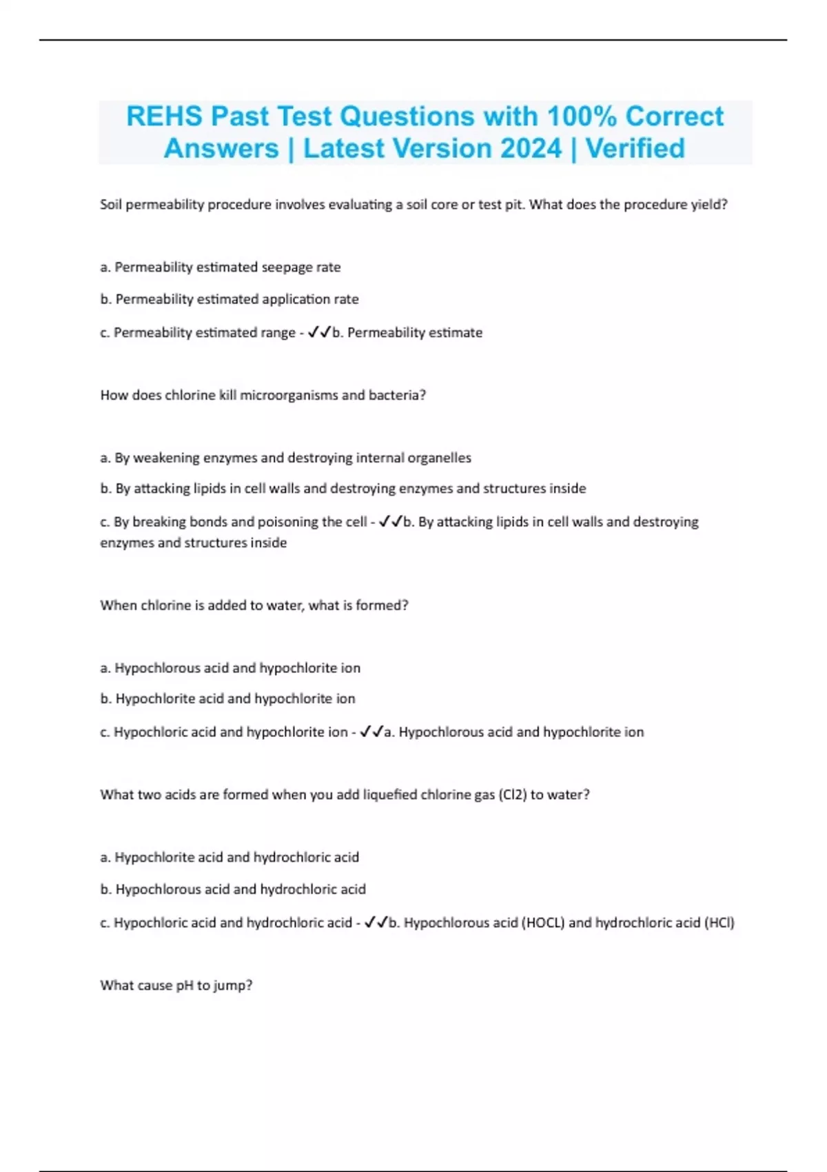 Soil permeability procedure involves evaluating a soil core or test pit. What does the procedure yield? a. Permeability estimated seepage rate b. Permeability estimated application rate c. Permeability estimated range - b. Permeability estimate How does chlorine kill microorganisms and bacteria? a. By weakening enzymes and destroying internal organelles b. By attacking lipids in cell walls and destroying enzymes and structures inside c. By breaking bonds and poisoning the cell - b. By attacking lipids in cell walls and destroying enzymes and structures inside When chlorine is added to water, what is formed? a. Hypochlorous acid and hypochlorite ion b. Hypochlorite acid and hypochlorite ion c. Hypochloric acid and hypochlorite ion - a. Hypochlorous acid and hypochlorite ion What two acids are formed when you add liquefied chlorine gas (Cl2) to water? a. Hypochlorite acid and hydrochloric acid b. Hypochlorous acid and hydrochloric acid c. Hypochloric acid and hydrochloric acid - b. Hypochlorous acid (HOCL) and hydrochloric acid (HCl) What cause pH to jump?a. Low alkalinity, precipitation, algae growth b. High alkalinity, precipitation, algae growth c. Low alkalinity, high calcium hardness, algae growth - a. Low alkalinity, precipitation, algae growth What do you add to lower pH?