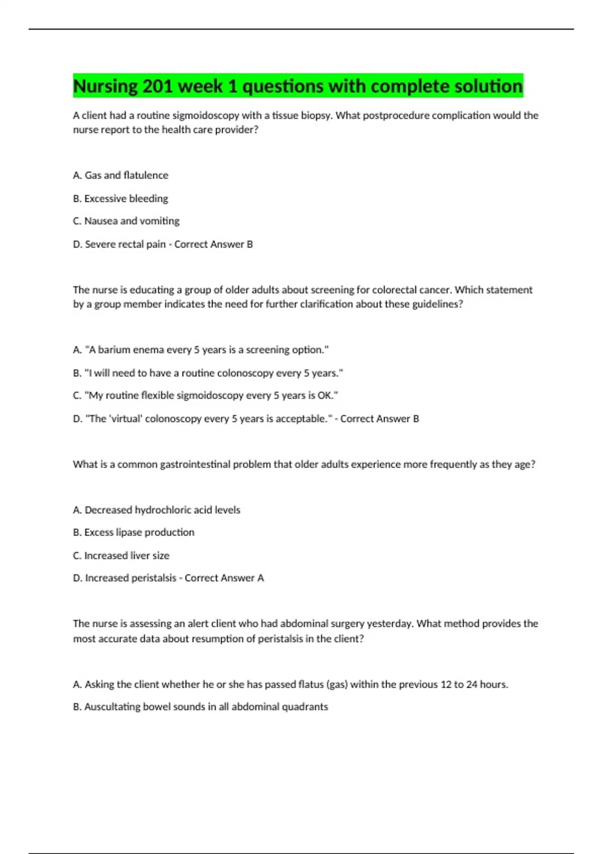 Nursing 201 week 1 questions with complete solution A client had a routine sigmoidoscopy with a tissue biopsy. What postprocedure complication would the nurse report to the health care provider? A. Gas and flatulence B. Excessive bleeding C. Nausea and vomiting D. Severe rectal pain - Correct Answer B The nurse is educating a group of older adults about screening for colorectal cancer. Which statement by a group member indicates the need for further clarification about these guidelines? A. "A barium enema every 5 years is a screening option." B. "I will need to have a routine colonoscopy every 5 years." C. "My routine flexible sigmoidoscopy every 5 years is OK." D. "The 'virtual' colonoscopy every 5 years is acceptable." - Correct Answer B What is a common gastrointestinal problem that older adults experience more frequently as they age? A. Decreased hydrochloric acid levels B. Excess lipase production C. Increased liver size D. Increased peristalsis - Correct Answer A The nurse is assessing an alert client who had abdominal surgery yesterday. What method provides the most accurate data about resumption of peristalsis in the client? A. Asking the client whether he or she has passed flatus (gas) within the previous 12 to 24 hours. B. Auscultating bowel sounds in all abdominal quadrants C. Counting the number of bowel sounds in each abdominal quadrant over one minute. D. Observing the abdomen for symmetry and distention - Correct Answer A The nurse is assessing a client who comes to the emergency department with acute abdominal pain. The nurse notes a bulging, pulsating mass when inspecting the abdomen. Which action by the nurse is correct? A. Auscultate the abdomen to determine the presence of bowel sounds. B. Notify the provider about this finding immediately. C. Palpate the client's abdomen to determine the outlines of the mass. D. Question the client about recent stool habits. - Correct Answer B A client is scheduled for a colonoscopy. What does the nurse tell the client to do before the procedure is performed?