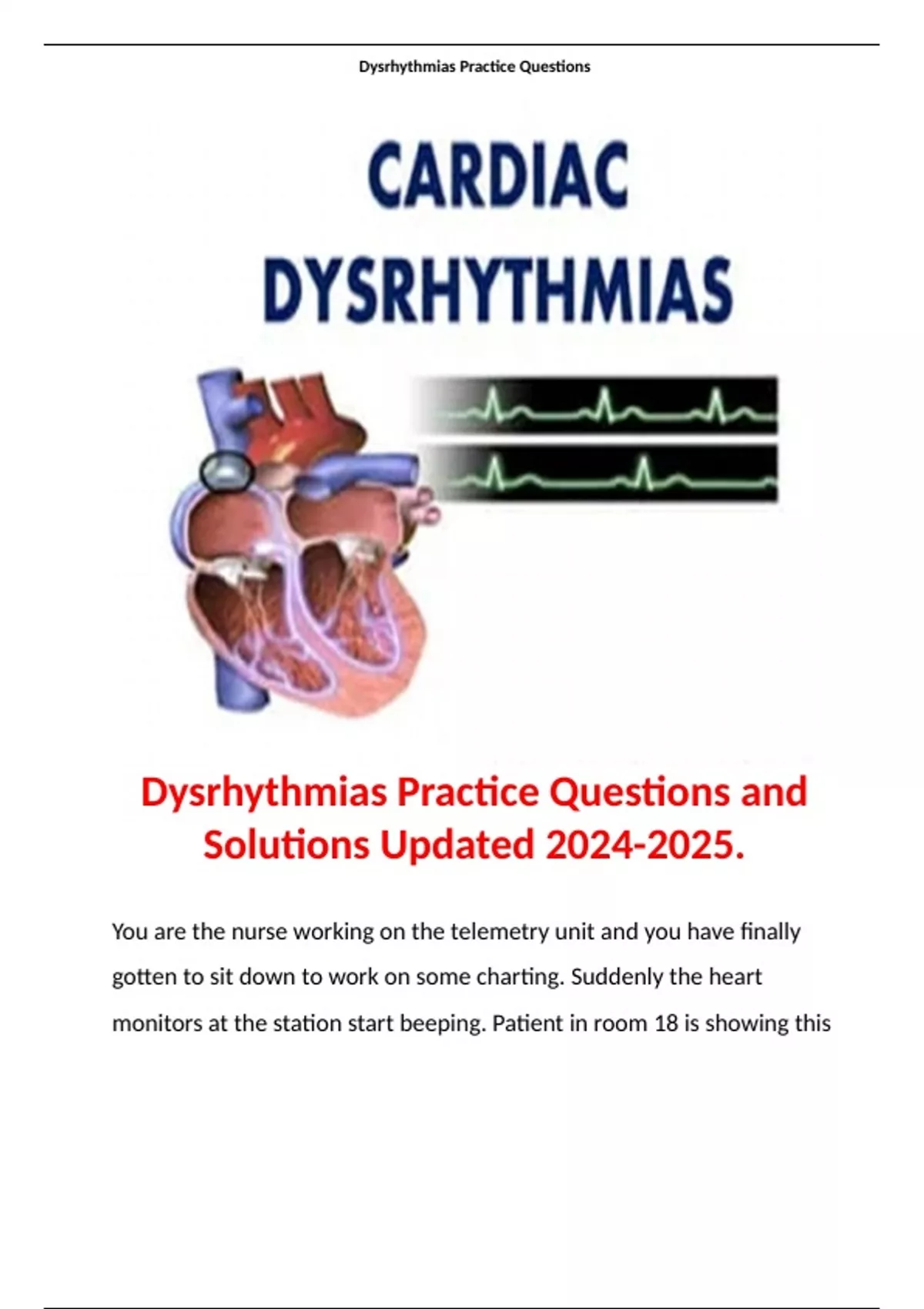 Dysrhythmias Practice Questions and Solutions Updated . Containing Terms like: You are the nurse working on the telemetry unit and you have finally gotten to sit down to work on some charting. Suddenly the heart monitors at the station start beeping. Patient in room 18 is showing this rhythm on the monitor. The medical team advances together into the room and finds them unconscious. What is priority action by the nurse? A) Prepare to administer adenosine to the patient B) Begin chest compressions C) Prepare for defibrillation D) Check for a pulse - Answer: Answer: D