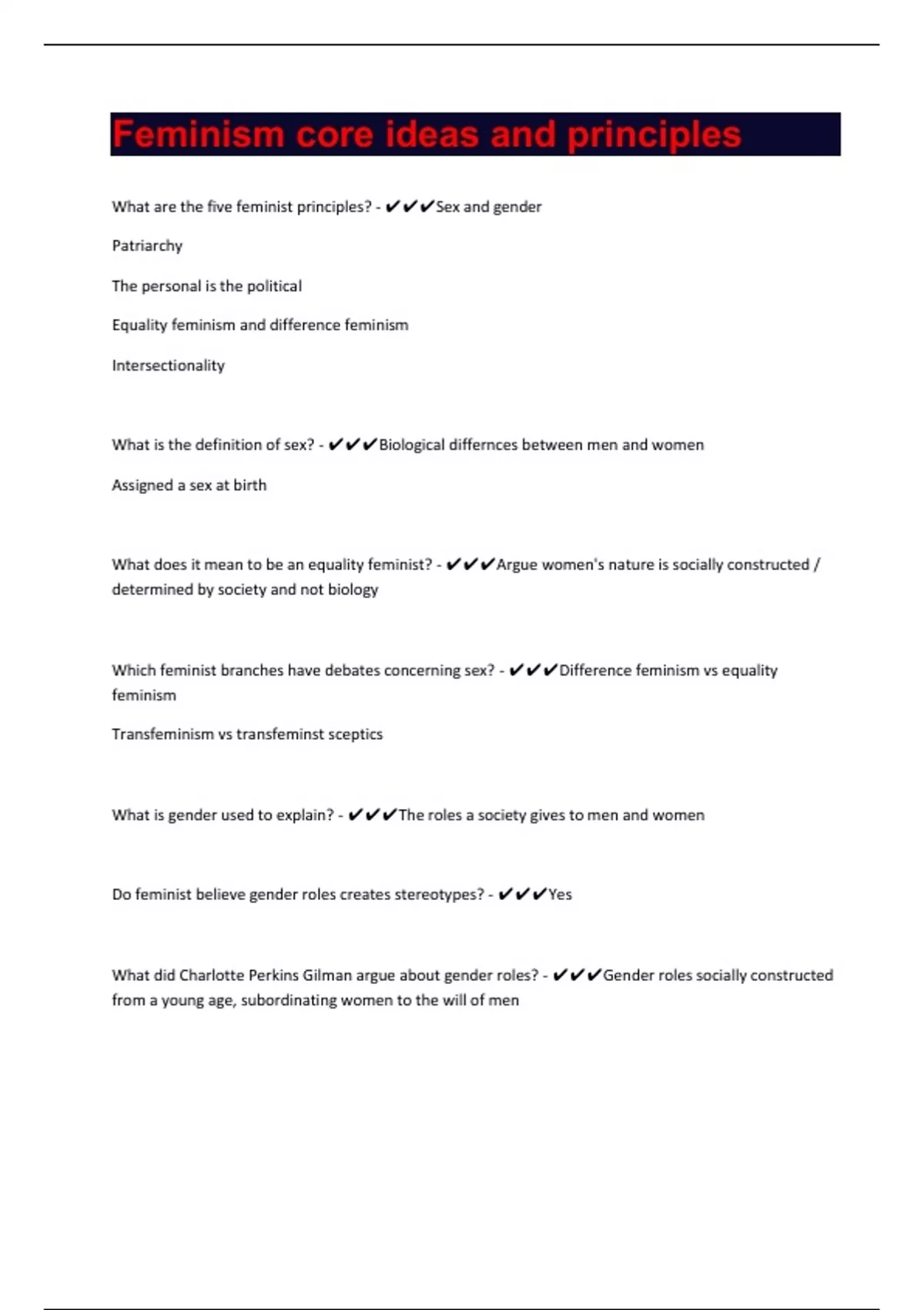 What are the five feminist principles? - Sex and gender Patriarchy The personal is the political Equality feminism and difference feminism Intersectionality What is the definition of sex? - Biological differnces between men and women Assigned a sex at birth What does it mean to be an equality feminist? - Argue women's nature is socially constructed / determined by society and not biology Which feminist branches have debates concerning sex? - Difference feminism vs equality feminism Transfeminism vs transfeminst sceptics What is gender used to explain? - The roles a society gives to men and women Do feminist believe gender roles creates stereotypes? - Yes What did Charlotte Perkins Gilman argue about gender roles? - Gender roles socially constructed from a young age, subordinating women to the will of men