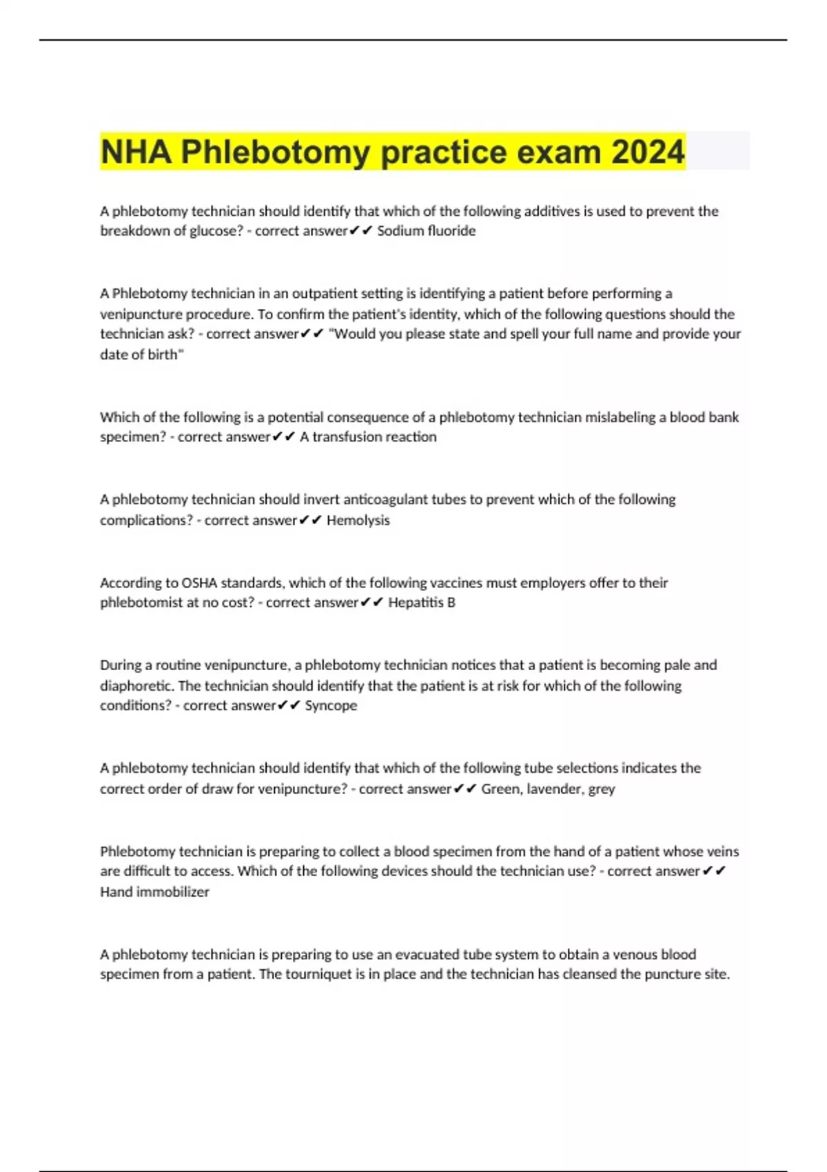 A phlebotomy technician should identify that which of the following additives is used to prevent the breakdown of glucose? - correct answer Sodium fluoride A Phlebotomy technician in an outpatient setting is identifying a patient before performing a venipuncture procedure. To confirm the patient's identity, which of the following questions should the technician ask? - correct answer "Would you please state and spell your full name and provide your date of birth" Which of the following is a potential consequence of a phlebotomy technician mislabeling a blood bank specimen? - correct answer A transfusion reaction A phlebotomy technician should invert anticoagulant tubes to prevent which of the following complications? - correct answer Hemolysis According to OSHA standards, which of the following vaccines must employers offer to their phlebotomist at no cost? - correct answer Hepatitis B During a routine venipuncture, a phlebotomy technician notices that a patient is becoming pale and diaphoretic. The technician should identify that the patient is at risk for which of the following conditions? - correct answer Syncope A phlebotomy technician should identify that which of the following tube selections indicates the correct order of draw for venipuncture? - correct answer Green, lavender, grey Phlebotomy technician is preparing to collect a blood specimen from the hand of a patient whose veins are difficult to access. Which of the following devices should the technician use? - correct answer Hand immobilizer A ph