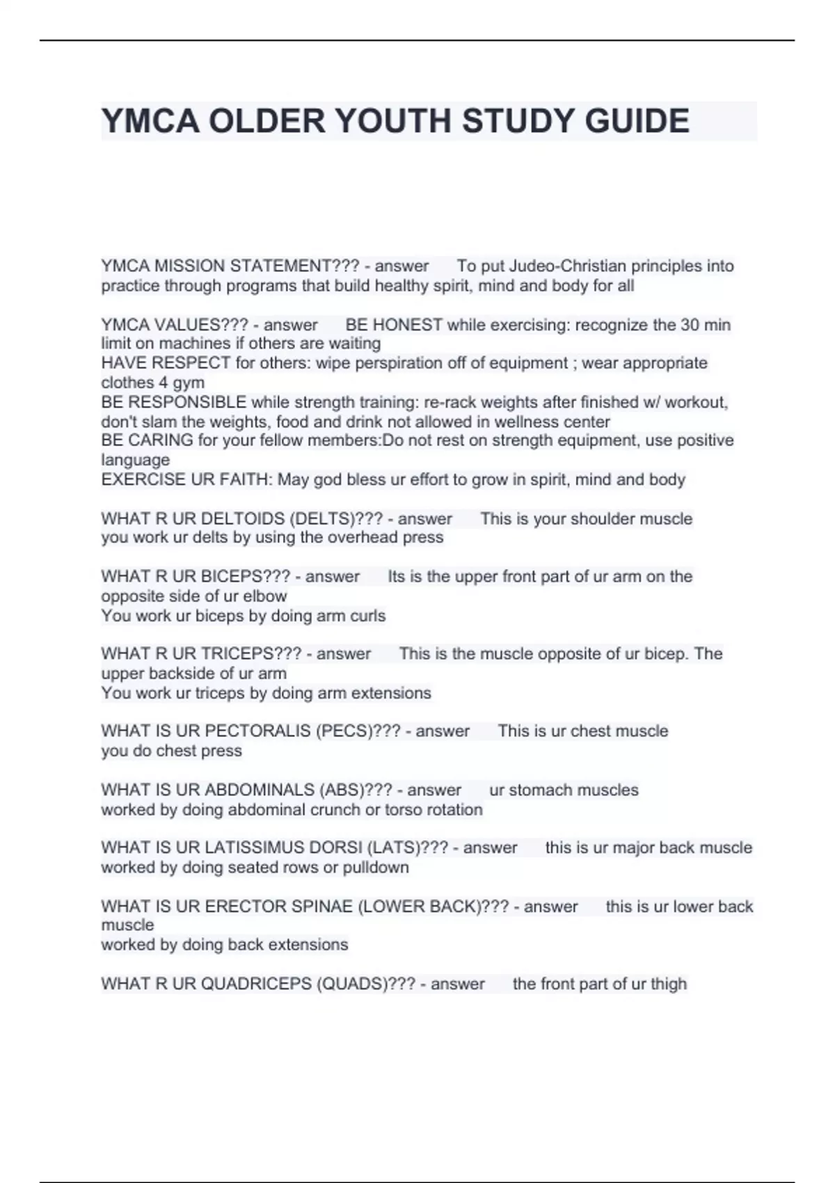 YMCA OLDER YOUTH STUDY GUIDE QUESTIONS AND ANSWERS 2024