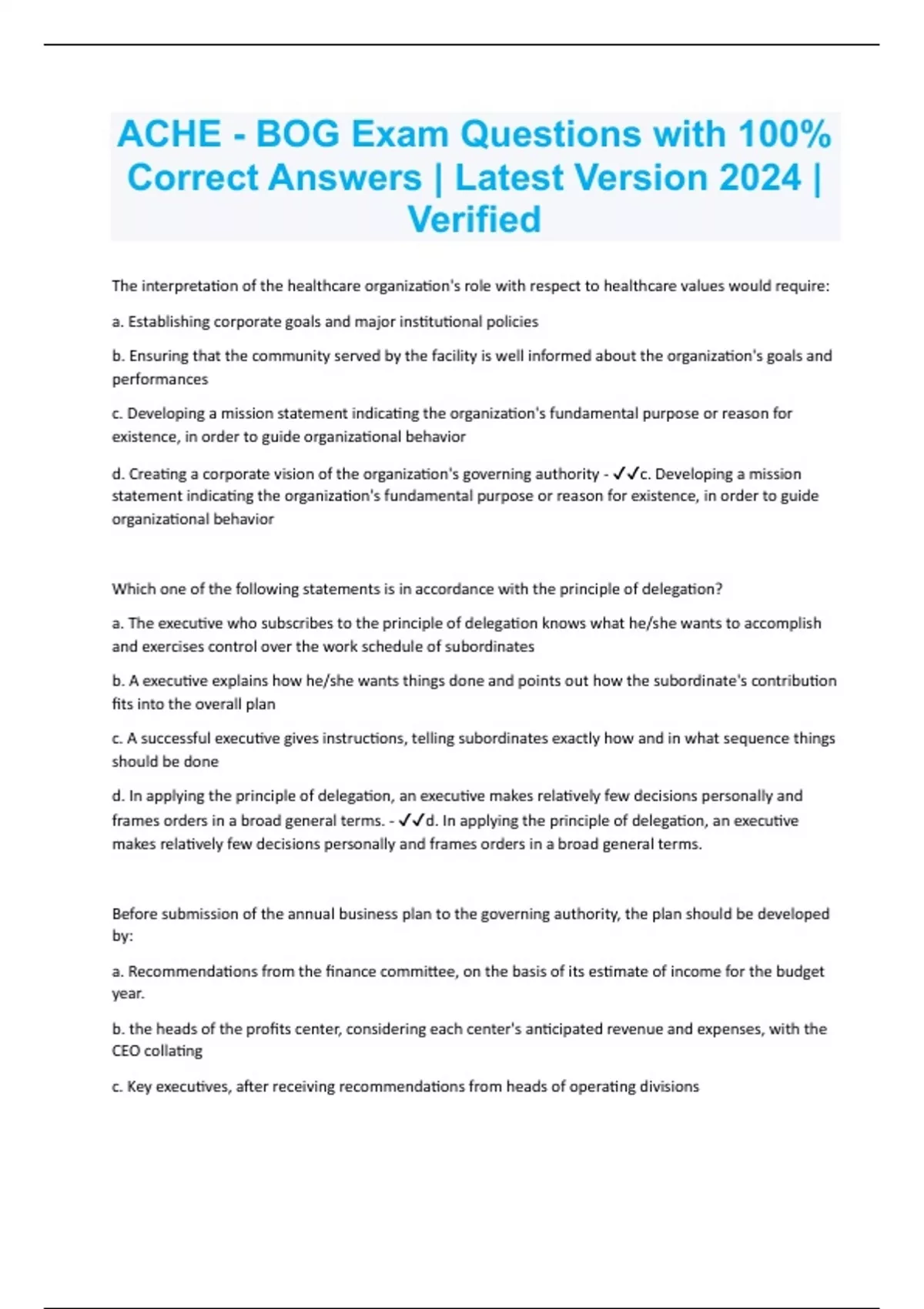 The interpretation of the healthcare organization's role with respect to healthcare values would require: a. Establishing corporate goals and major institutional policies b. Ensuring that the community served by the facility is well informed about the organization's goals and performances c. Developing a mission statement indicating the organization's fundamental purpose or reason for existence, in order to guide organizational behavior d. Creating a corporate vision of the organization's governing authority - c. Developing a mission statement indicating the organization's fundamental purpose or reason for existence, in order to guide organizational behavior Which one of the following statements is in accordance with the principle of delegation? a. The executive who subscribes to the principle of delegation knows what he/she wants to accomplish and exercises control over the work schedule of subordinates b. A executive explains how he/she wants things done and points out how the subordinate's contribution fits into the overall plan c. A successful executive gives instructions, telling subordinates exactly how and in what sequence things should be done d. In applying the principle of delegation, an executive makes relatively few decisions personally and frames orders in a broad general terms. - d. In applying the principle of delegation, an executive makes relatively few decisions personally and frames orders in a broad general terms. Before submission of the annual business plan to the governing authority, the plan should be developed by: a. Recommendations from the finance committee, on the basis of its estimate of income for the budget year. b. the heads of the profits center, considering each center's anticipated revenue and expenses, with the CEO collating c. Key executives, after receiving recommendations from heads of operating divisions
