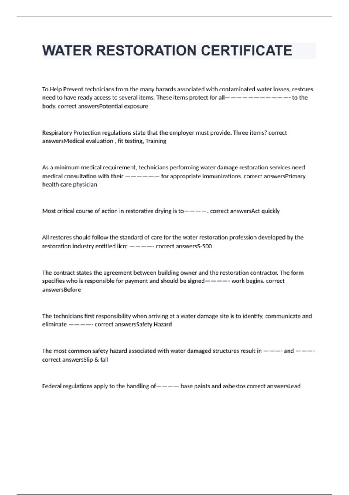 To Help Prevent technicians from the many hazards associated with contaminated water losses, restores need to have ready access to several items. These items protect for all———————————- to the body. correct answersPotential exposure Respiratory Protection regulations state that the employer must provide. Three items? correct answersMedical evaluation , fit testing, Training As a minimum medical requirement, technicians performing water damage restoration services need medical consultation with their —————— for appropriate immunizations. correct answersPrimary health care physician Most critical course of action in restorative drying is to————. correct answersAct quickly All restores should follow the standard of care for the water restoration profession developed by the restoration industry entitled iicrc ————- correct answersS-500 The contract states the agreement between building owner and the restoration contractor. The form specifies who is responsible for payment and should be signed————- work begins. correct answersBefore The technicians first responsibility when arriving at a water damage site is to identify, communicate and eliminate ————- correct answersSafety Hazard The most common safety hazard associated with water damaged structures result in ———- and ———- correct answersSlip & fall Federal regulations apply to the handling of———— base paints and asbestos correct answersLead