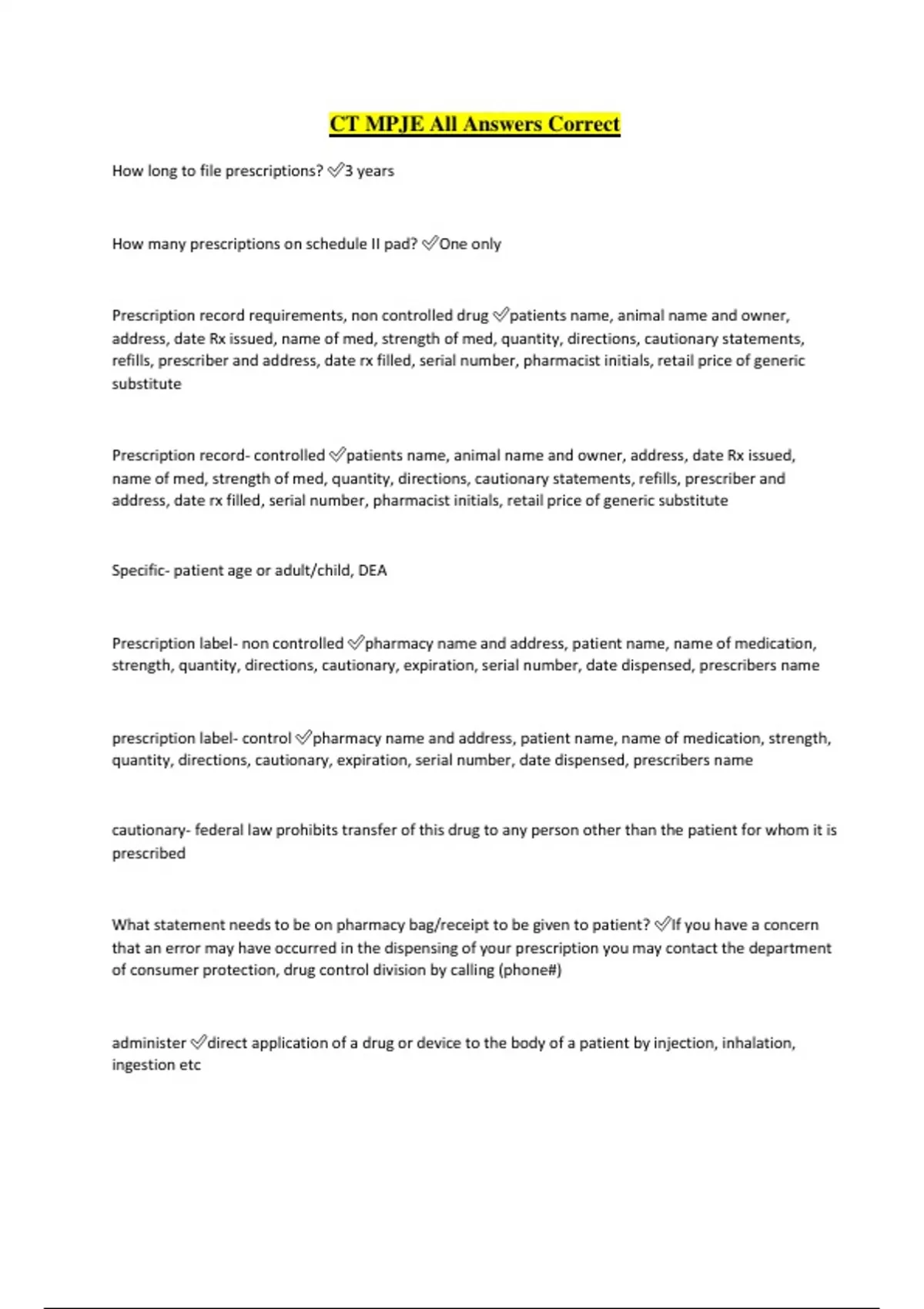 CT MPJE All Answers Correct How long to file prescriptions? 3 years How many prescriptions on schedule II pad? One only Prescription record requirements, non controlled drug patients name, animal name and owner, address, date Rx issued, name of med, strength of med, quantity, directions, cautionary statements, refills, prescriber and address, date rx filled, serial number, pharmacist initials, retail price of generic substitute Prescription record- controlled patients name, animal name and owner, address, date Rx issued, name of med, strength of med, quantity, directions, cautionary statements, refills, prescriber and address, date rx filled, serial number, pharmacist initials, retail price of generic substitute Specific- patient age or adult/child, DEA Prescription label- non controlled pharmacy name and address, patient name, name of medication, strength, quantity, directions, cautionary, expiration, serial number, date dispensed, prescribers name prescription label- control pharmacy name and address, patient name, name of medication, strength, quantity, directions, cautionary, expiration, serial number, date dispensed, prescribers name cautionary- federal law prohibits transfer of this drug to any person other than the patient for whom it is prescribed What statement needs to be on pharmacy bag/receipt to be given to patient? If you have a concern that an error may have occurred in the dispensing of your prescription you may contact the department of consumer protection, drug control division by calling (phone#) administer direct application of a drug or device to the body of a patient by injection, inhalation, ingestion etc care giving instruction institution that provides medical services and is licensed, operated, certified or approved by the commissions compound to combine, mix, or put together two or more ingredients pursuant to a prescription and includes the preparation of drugs or devices in anticipation of prescriptions based on routine regularly observed prescribing patterns dispense processing a drug or device for delivery or for administration for a patient pursuant to prescription does not include act of delivering the drug or device to the patient or administering to the patient dispensing outpatient facility facility operated by a corporation or municipality which provides medical services to patients on an outpatient basis drug article recognized by the official US pharmacopoeia, intended for the use in diagnosis, cure, mitigation, treatment, or prevention of disease in humans or other animals, intended to affect the structure of any function of thebody, institutional pharmacy area within a care-giving institution or within a correctional institution that is under the direct charge of a pharmacist legend device device that is required to be dispensed pursuant only to a prescription or is restriction to use by prescribing practioners, required to bear the legends -RX only in accordance with guidelines established in the federal food, drug and consmetic act -caution- federal law restricts this device for use by or on the order of a licensed veterinarian legend drug drug that is required to be used with a prescription must have the lengend RX only in accordance with guidelines established in the federal food, drug and