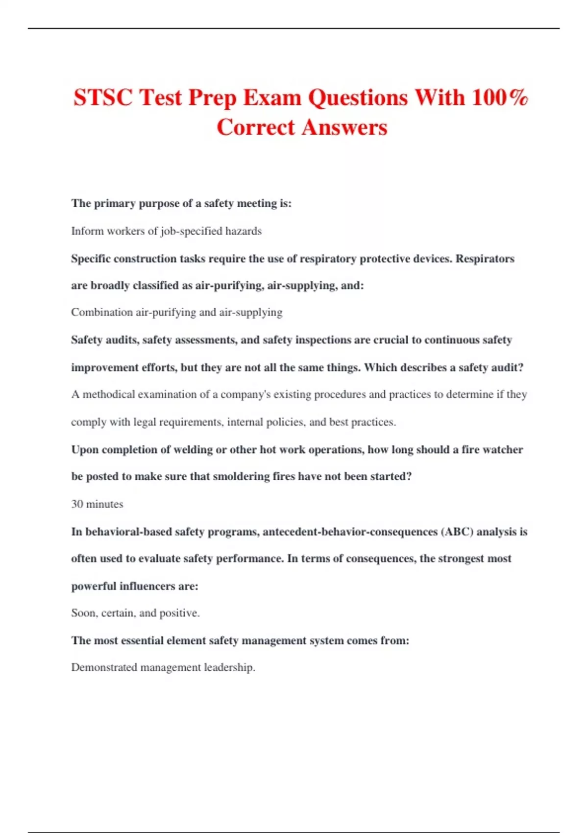 STSC Test Prep Exam Questions With 100% Correct Answers The primary purpose of a safety meeting is: Inform workers of job-specified hazards Specific construction tasks require the use of respiratory protective devices. Respirators are broadly classified as air-purifying, air-supplying, and: Combination air-purifying and air-supplying Safety audits, safety assessments, and safety inspections are crucial to continuous safety improvement efforts, but they are not all the same things. Which describes a safety audit? A methodical examination of a company's existing procedures and practices to determine if they comply with legal requirements, internal policies, and best practices. Upon completion of welding or other hot work operations, how long should a fire watcher be posted to make sure that smoldering fires have not been started? 30 minutes In behavioral-based safety programs, antecedent-behavior-consequences (ABC) analysis is often used to evaluate safety performance. In terms of consequences, the strongest most powerful influencers are: Soon, certain, and positive. The most essential element safety management system comes from: Demonstrated management leadership. A behavioral approach to safety focuses on consequences as an important motivator for future safe behaviors. Consequences can be described by their timing, consistency, and significance. The MOST powerful consequences are: Soon, uncertain, positive. What is the primary function of a loss control system? Identify hazards conditions, assess their risks, and establish effective risk control measures. A key factor for implementing a good safety program involves: Getting foreman and supervisors involved. In the context of Accident Investigation, a safety procedure is an example of what? A management system The three components of an effective construction site safety inspection procedure are planning, fieldwork, and: Follow-up. Which is the most appropriate measurement of individual safety performance? Recognize workers for reporting hazards and correcting them. Risk is a combination of: The probability that an adverse event will occur and the severity of the consequences of the adverse event. Most jurisdictions allow employers to implement drug testing programs to detect employee use of illegal drugs in the work environment. The categories of tests include post-job offer, random, post-accident, and: Reasonable suspicion (probable cause). An example of a human factor contributing to an incident is: