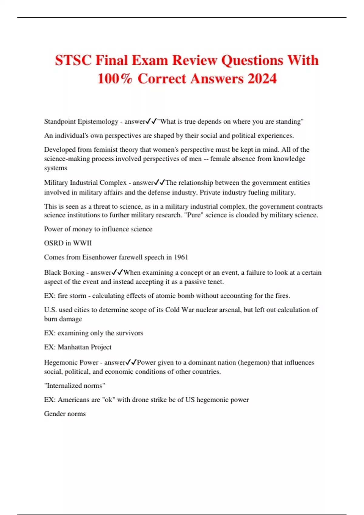 STSC Final Exam Review Questions With 100% Correct Answers 2024 Standpoint Epistemology - answer"What is true depends on where you are standing" An individual's own perspectives are shaped by their social and political experiences. Developed from feminist theory that women's perspective must be kept in mind. All of the science-making process involved perspectives of men -- female absence from knowledge systems Military Industrial Complex - answerThe relationship between the government entities involved in military affairs and the defense industry. Private industry fueling military. This is seen as a threat to science, as in a military industrial complex, the government contracts science institutions to further military research. "Pure" science is clouded by military science. Power of money to influence science OSRD in WWII Comes from Eisenhower farewell speech in 1961 Black Boxing - answerWhen examining a concept or an event, a failure to look at a certain aspect of the event and instead accepting it as a passive tenet. EX: fire storm - calculating effects of atomic bomb without accounting for the fires. U.S. used cities to determine scope of its Cold War nuclear arsenal, but left out calculation of burn damage EX: examining only the survivors EX: Manhattan Project Hegemonic Power - answerPower given to a dominant nation (hegemon) that influences social, political, and economic conditions of other countries. "Internalized norms" EX: Americans are "ok" with drone strike bc of US hegemonic power Gender norms EX: The US (along w USSR) was a hegemonic power after WWII. The US used its hegemonic power to use military industrialized complex to influence other countries Internalization of existing power norms performed by that power's subjects Teleology - answerA purpose that a particular object is created for. A bomb is created to destroy Philosophical study of nature that describes things based on their apparent purpose Technical Distancing - answerMeasuring physical distance from bomb target from warplane "Making decisions from above" Industrialized logic of strategic airfare (WWII) Distance network of culpability from effect on victims For example, line of thought like "I didn't make the bomb or choose to use it - I just flew the plane that dropped it" Drones Fascism - answerAn ideology that a totalitarian one-party state (usually under a dictator) is necessary to prepare a nation for armed conflict and to respond effectively to economic difficulties. Tenets: nationalism, disdain for human rights, military-focus, control of mass media, intellectualism seen as a threat, misogyny, racism Examples: Italy and Germany during WWII. Fascism deteriorated when the Allies won during WWII Garrison State - answerA proposed future state where those who specialize in violence are the most powerful members of society. In this case, rise of the power of scientists who are involved in military science. 1941, sociologist Harold Lasswell: specialists in violence are most powerful group in society Consumption Junction - answerIlluminates power relationships between the "consumer" and technology In relation to the atomic bomb, the consumption junction refers to the method of looking at those affected by the atomic bomb (its consumers) Starts analysis with users of technological systems and draws network from there out Sociotechnical System - answerDeveloped by Gribeauval in the 1700s System that recognizes the relationship between the human and technology Material and human consensus agreement Examples: Guns standardized and simplified Carts were improved to handle rough terrains Horses aligned side by side Technological Momentum - answerTechnology is not infinitely malleable. As a technology comes to light, society is able to control the technology. However, as the technological development rapidly expands, there is a certain point where the technology becomes enmeshed into society and no longer is responsive to outside pressures. Some people believe in social determinism, some tech determinism.....tech momentum is a combination of the two Thomas Hughes Systems gain momentum as they are implemented and succeed in their "goal-orientation." Technological momentum refers to the general property of systems that reach and maintain some "lock-in" that produces predictable interaction. Large systems, he suggests, eventually resist change. Technological Choice - answerThere is a role for users in the advancement of technology Focus on the consumers of technology Example: gun technology took different forms in different places. Used in Africa as currency to buy slaves, used by Native Americans to ambush (Malone reading) Compartmentalization - answerA defense mechanism that was experienced by scientists as response to the dropping of the atomic bomb to deal with possible guilt "I dropped the bomb but I did not choose the target" Placing blame on others unconscious psychological defense mechanism used to avoid cognitive dissonance, or the mental discomfort and anxiety caused by a person's having conflicting values, cognitions, emotions, beliefs, etc. within Each person should be given only that data about the project that was needed in order for them to do the job that was assigned. The number of people who had any overall knowledge of what was being done was severely restricted The American Century - answer20th century America as the global superpower (in front of USSR)