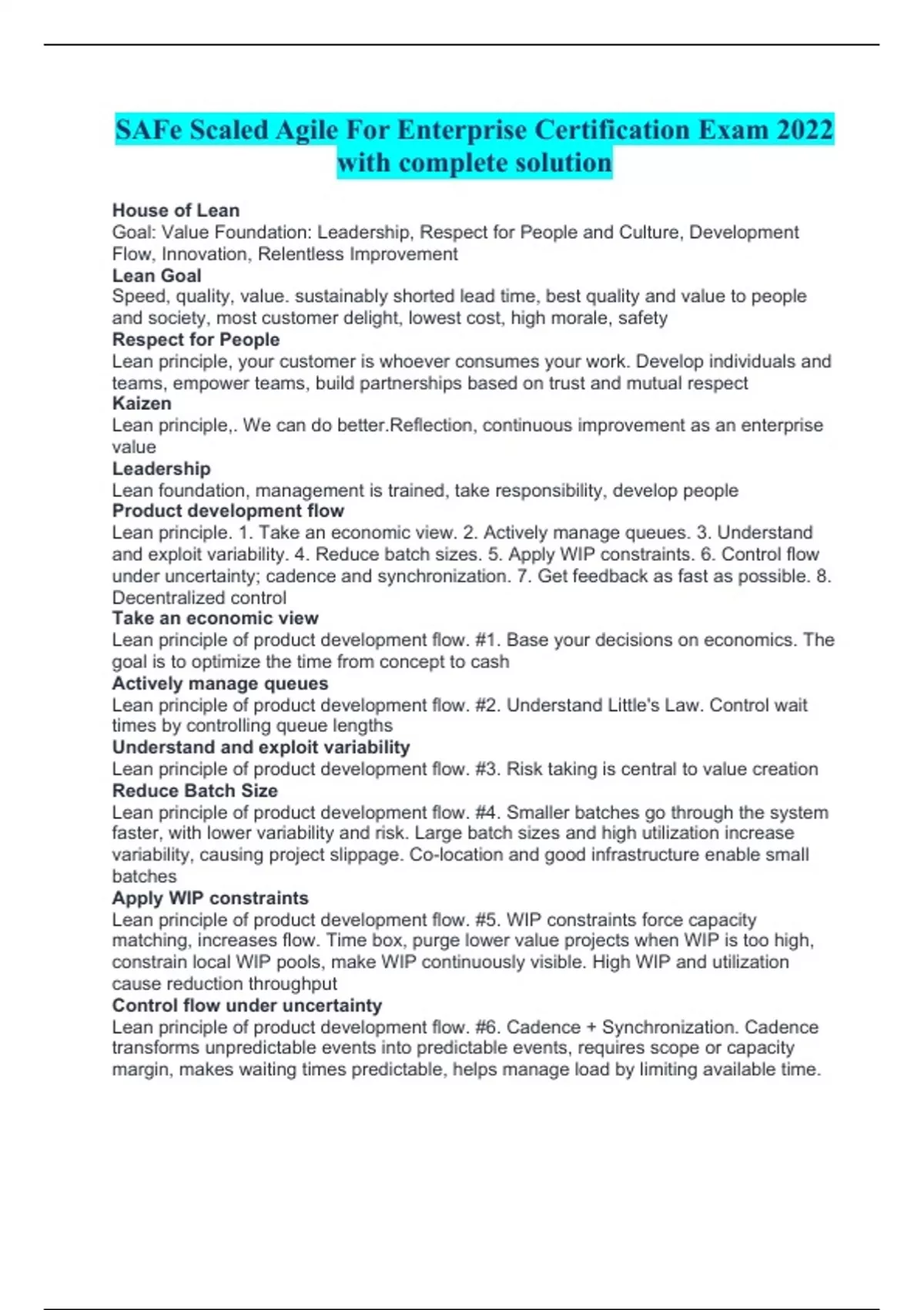 SAFe Scaled Agile For Enterprise Certification Exam 2022 with complete solution House of Lean Goal: Value Foundation: Leadership, Respect for People and Culture, Development Flow, Innovation, Relentless Improvement Lean Goal Speed, quality, value. sustainably shorted lead time, best quality and value to people and society, most customer delight, lowest cost, high morale, safety Respect for People Lean principle, your customer is whoever consumes your work. Develop individuals and teams, empower teams, build partnerships based on trust and mutual respect Kaizen Lean principle,. We can do better.Reflection, continuous improvement as an enterprise value Leadership Lean foundation, management is trained, take responsibility, develop people Product development flow Lean principle. 1. Take an economic view. 2. Actively manage queues. 3. Understand and exploit variability. 4. Reduce batch sizes. 5. Apply WIP constraints. 6. Control flow under uncertainty; cadence and synchronization. 7. Get feedback as fast as possible. 8. Decentralized control Take an economic view Lean principle of product development flow. #1. Base your decisions on economics. The goal is to optimize the time from concept to cash Actively manage queues Lean principle of product development flow. #2. Understand Little's Law. Control wait times by controlling queue lengths Understand and exploit variability Lean principle of product development flow. #3. Risk taking is central to value creation Reduce Batch Size Lean principle of product development flow. #4. Smaller batches go through the system faster, with lower variability and risk. Large batch sizes and high utilization increase variability, causing project slippage. Co-location and good infrastructure enable small batches Apply WIP constraints Lean principle of product development flow. #5. WIP constraints force capacity matching, increases flow. Time box, purge lower value projects when WIP is too high, constrain local WIP pools, make WIP continuously visible. High WIP and utilization cause reduction throughput Control flow under uncertainty Lean principle of product development flow. #6. Cadence + Synchronization. Cadence transforms unpredictable events into predictable events, requires scope or capacity margin, makes waiting times predictable, helps manage load by limiting available time. Regular systemwide integration provides higher fidelity tests and objective solution assessment Get fast feedback Lean principle of product development flow. #7. Product development is the process of converting uncertainty to knowledge. Fast feedback accelerates knowledge Decentralized control Lean principle of product development flow. #8. Centralize control for decisions that are infrequent and can be applied globally, have significant economies of scale or high-risk. Decentralized control for time critical, local decisions Planning is for alignment Lean principle of product development flow. #9. There is more value created with overall alignment than with local excellence. Agile aims to change the plan when something changes Agile values: Individuals and interactions Over processes and tools Agile values: working software Over comprehensive documentation Agile values: customer collaboration Over contract negotiation Agile values: responding to change Over following a plan Agile drivers in the triangle. Value and quality driven, the vision creates feature estimates, fix the dates and float the scope Agile benefits Early value delivery drives first to market, fast feedback, profitability, makes money faster, reduces risk, delivers better fit for purpose SAFe core values Alignment, Code quality, Transparency, program execution Four SAFe business results Increased employee engagement, 20-50% increase in productivity, 30-70% faster time to market, 50% defect reduction Describe an Agile team Empowered, self organizing, self managing, cross functional, deliver fully tested code every two weeks How does an Agile team deliver value? In user stories Describe a SAFe team that is scaled to program level Self organizing, self managing team of Agile teams, continuous value delivery, aligned to a common mission via a single program backlog How do program level safe teams deliver value? In features and benefits Describe how SAFe is scaled to the portfolio level. Using Lean approaches to strategy and investment funding, program management, and governance. Centralized strategy and decentralized execution. Objective metrics support governance and kaizen How does portfolio level SAFe deliver value? In business and architectural epics What is the product owner's content authority? User stories What is product management content authority? Features What is the typical ratio of product management to product owners? One PM to four PO What is the typical size of an Agile Release Train 5-12 teams 50-125 people What is the typical ART program increment time box? 10 weeks What are the shared teams in Agile Release Train? DevOps, UX, System Architect, RTE How often is the team demo in the ART? Every two weeks How often is the inspect and adapt in an ART? Every 10 weeks What makes a good Agile team? They are independent, cross functional, self organizing, self managing, define, build, test code, optimized for communication to deliver value every two weeks. Team size 7 +/- 2 What are the Agile team Product Owner responsibilities? Define and accept stories, act as the customer for developer questions, work with product management to plan releases What are the developer or tester responsibilities in the Agile team? Create and refine user stories and acceptance criteria, define - build - test and deliver stories, develop and commit to team PI objectives and Sprint plans What is the Release Train Engineer's role in ART? The Chief Scrum Master for the train. What is Product Management's role in the ART? Own, define,and prioritize the Program Backlog What is the System's Architect role in ART? Provide architectural g