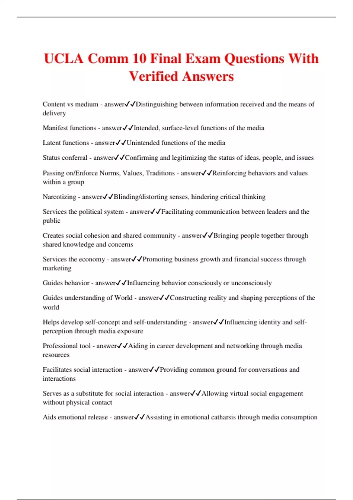 UCLA Comm 10 Final Exam Questions With Verified Answers Content vs medium - answerDistinguishing between information received and the means of delivery Manifest functions - answerIntended, surface-level functions of the media Latent functions - answerUnintended functions of the media Status conferral - answerConfirming and legitimizing the status of ideas, people, and issues Passing on/Enforce Norms, Values, Traditions - answerReinforcing behaviors and values within a group Narcotizing - answerBlinding/distorting senses, hindering critical thinking Services the political system - answerFacilitating communication between leaders and the public Creates social cohesion and shared community - answerBringing people together through shared knowledge and concerns Services the economy - answerPromoting business growth and financial success through marketing Guides behavior - answerInfluencing behavior consciously or unconsciously Guides understanding of World - answerConstructing reality and shaping perceptions of the world Helps develop self-concept and self-understanding - answerInfluencing identity and self- perception through media exposure Professional tool - answerAiding in career development and networking through media resources Facilitates social interaction - answerProviding common ground for conversations and interactions Serves as a substitute for social interaction - answerAllowing virtual social engagement without physical contact Aids emotional release - answerAssisting in emotional catharsis through media consumption