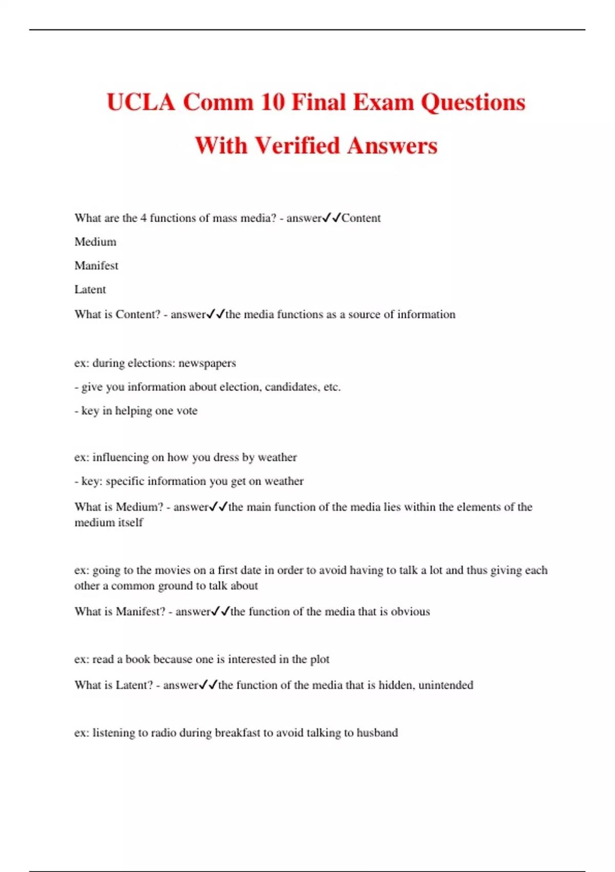UCLA Comm 10 Final Exam Questions With Verified Answers What are the 4 functions of mass media? - answerContent Medium Manifest Latent What is Content? - answerthe media functions as a source of information ex: during elections: newspapers - give you information about election, candidates, etc. - key in helping one vote ex: influencing on how you dress by weather - key: specific information you get on weather What is Medium? - answerthe main function of the media lies within the elements of the medium itself ex: going to the movies on a first date in order to avoid having to talk a lot and thus giving each other a common ground to talk about What is Manifest? - answerthe function of the media that is obvious ex: read a book because one is interested in the plot What is Latent? - answerthe function of the media that is hidden, unintended ex: listening to radio during breakfast to avoid talking to husband What are the 6 (Societal) Functions of Mass Media? - answerStatus Confirm Pass on/Enforces traditions, norms, values Narcotizing Effect Services Political System Create Social Cohesion Services Economy How does it Confirm Status? - answerMedia confirms status of organization, people, event by reporting on them; thus making them important - media legitimizes people/issues ex: Gay student killed: media covered; gay rights got covered How does it Pass on/Enforces traditions, norms, values? - answerMedia tells what's right and what's wrong - certain news tells what to do and makes sure you follow them - usually mass media upholds status quo - giving homogenizing effect ex: man doesn't pay taxes: story comes out then he went to jail How does it have a Narcotizing Effect? - answernarcotics: destroys senses - media blinds and distorts our senses; thus, failing to support critical thinking ex: media floods us with information so much that we're numb and don't have time to carefully consider - makes us apathetic; thus, failing to raise critical questions and thinking How does it service Political System? - answerleaders use mass media to address public ex: tells you what's happening on your news feed - learn what candidates say helps political system work How does it create Social Cohesion? - answerbrings us together - gather around particular social website ex: jumps online to see what's going on during dramatic crisis ex: 9/11 -- victims, volunteers being alone --> scared watching TV --> brings together How does it service Economy? - answerhelps economy work with business/market reports - advertising makes capitalist economy work - sells products = more jobs - use internet for commerce What are the 8 functions of Mass Media served for individuals? - answerGuide our Behavior Guide our Understanding Professional Tool Develop Self Concept Facilitate Social Interactions Substitute for Social Interaction Emotional Release Ritualizes our Lives How does it guide our behavior? - answerwhat we learn from the media can influence our actions ex: watching movies and seeing how they behave in dates; thus, influencing one's behavior in dates How does it guide our understanding? - answermedia can influence how we think about the world - gives us a grasp on the world ex: Mean World Syndrome - mass media makes viewers believe that the world is more dangerous than it actually is - you used to take walks, but TV made you think that it was scary; thus, not wanting to walk anymore and just staying inside How is it a professional tool? - answermedia helps careers ex: lawyer read law journal to help in career - internet allows people to come together () How does it develop self concept? - answermedia can influence how you think about yourself - identification: create concepts about yourself (who are your role models?) ex: watching grey's anatomy: wants to become a doctor How does it facilitate social interactions? - answermediates ex: social media (twitter, facebook) brings people together How does it substitute for social interactions? - answerconnects with people through media - gives you indirect companionship ex: watching Friends (on netflix) - you aren't alone - forming substitute for real life humans How does it have an emotional release? - answercarries you out to another emotion ex: tired --> listens to music How does it ritualize our lives? - answergives order / sense of structure - brings us security