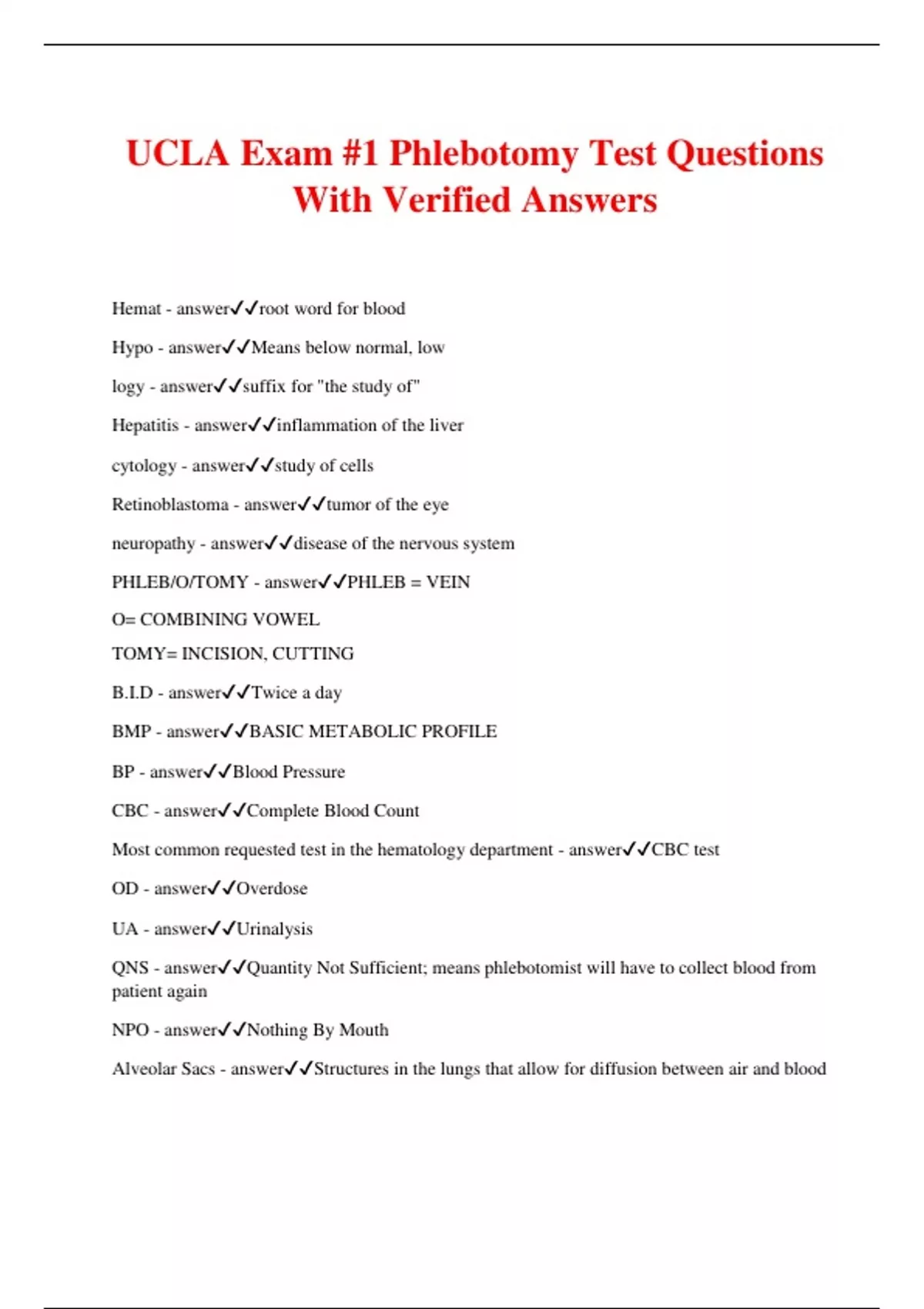 UCLA Exam #1 Phlebotomy Test Questions With Verified Answers Hemat - answerroot word for blood Hypo - answerMeans below normal, low logy - answersuffix for "the study of" Hepatitis - answerinflammation of the liver cytology - answerstudy of cells Retinoblastoma - answertumor of the eye neuropathy - answerdisease of the nervous system PHLEB/O/TOMY - answerPHLEB = VEIN O= COMBINING VOWEL TOMY= INCISION, CUTTING B.I.D - answerTwice a day BMP - answerBASIC METABOLIC PROFILE BP - answerBlood Pressure CBC - answerComplete Blood Count Most common requested test in the hematology department - answerCBC test OD - answerOverdose UA - answerUrinalysis QNS - answerQuantity Not Sufficient; means phlebotomist will have to collect blood from patient again NPO - answerNothing By Mouth Alveolar Sacs - answerStructures in the lungs that allow for diffusion between air and blood Amniotic Fluid - answerfluid form amniotic sac Atria - answer(atriums) upper chambers of the heart. Ventricles - answerlower chambers of the heart Aorta - answerlargest artery in the body Arteries - answercarry oxygenated blood away from the heart, except for pulmonary artery to lungs which carries deoxygenated blood. arterioles - answersmaller branches of arteries. superior vena cava - answerone of the largest veins in the circulatory system that carries deoxygenated blood from the upper parts of the body such as, head, neck, and chest. Inferior Vena Cava - answerone of the two largest veins that bring deoxygenated blood from the lower parts of the body. veins - answerCarry deoxygenated blood back to the heart venules - answersmaller branches of veins Capillaries - answerMicroscopic, unicellular blood vessels linking arterioles and venules collection of blood from finger in adults collection of blood from heel in infants. Blood Vessels - answer1. Transport Blood 2. Key to Circulatory System 3. Includes, arteries, veins, venules, arterioles, and capillaries Circulatory System - answerComposed of heart, blood vessels, and blood Antecubital Fossa - answer1. Where the elbow bends 2. Anterior 3. Major veins of venipuncture are found here for blood collection. Median Cubital Vein - answer1. 1st choice of blood collection (venipuncture) 2. Most commonly used by phlebotomist Cephalic Vein - answer2nd choice of blood collection (venipuncture),