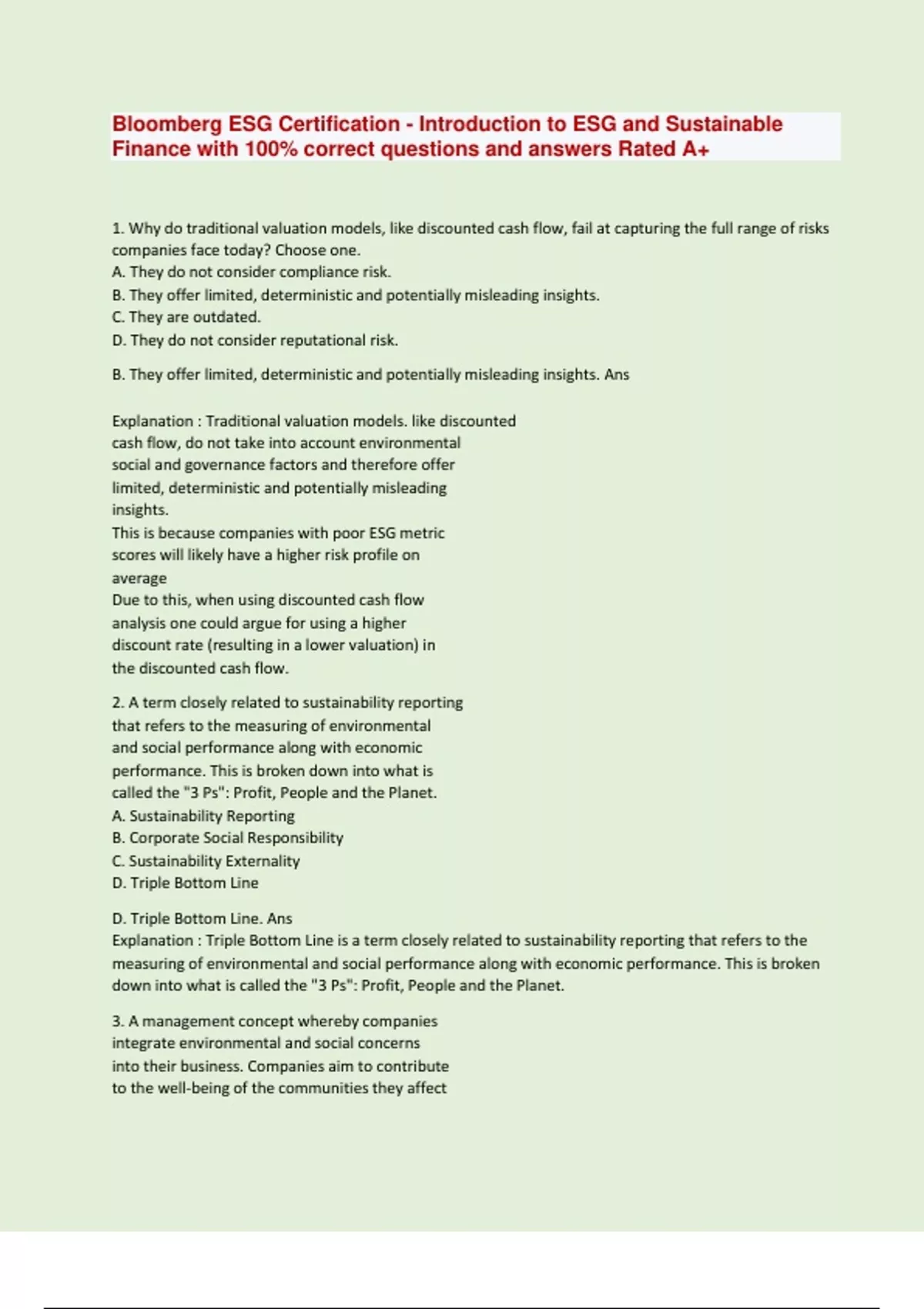Bloomberg ESG Certification - Introduction to ESG and Sustainable Finance with 100% correct questions and answers Rated A+