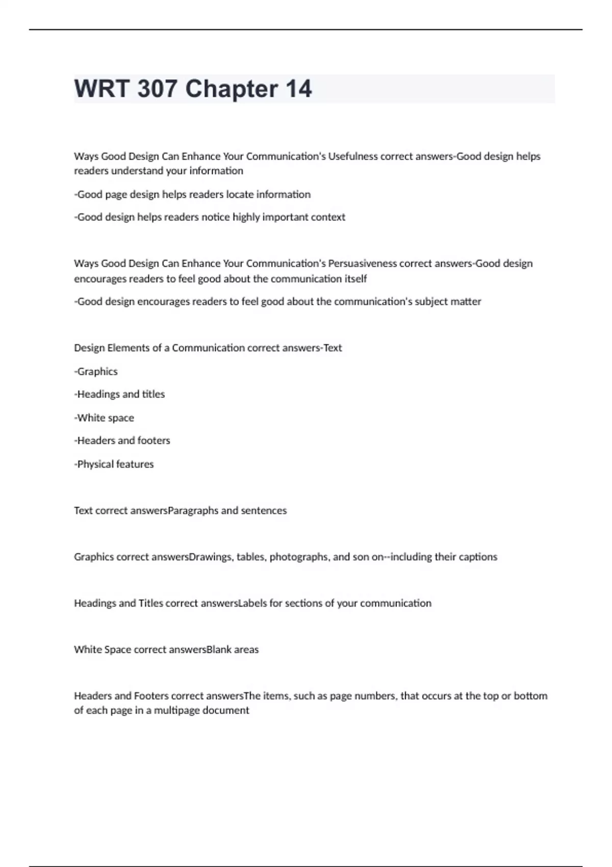 Ways Good Design Can Enhance Your Communication's Usefulness correct answers-Good design helps readers understand your information -Good page design helps readers locate information -Good design helps readers notice highly important context Ways Good Design Can Enhance Your Communication's Persuasiveness correct answers-Good design encourages readers to feel good about the communication itself -Good design encourages readers to feel good about the communication's subject matter Design Elements of a Communication correct answers-Text -Graphics -Headings and titles -White space -Headers and footers -Physical features Text correct answersParagraphs and sentences Graphics correct answersDrawings, tables, photographs, and son on--including their captions Headings and Titles correct answersLabels for sections of your communication White Space correct answersBlank areas Headers and Footers correct answersThe items, such as page numbers, that occurs at the top or bottom of each page in a multipage document