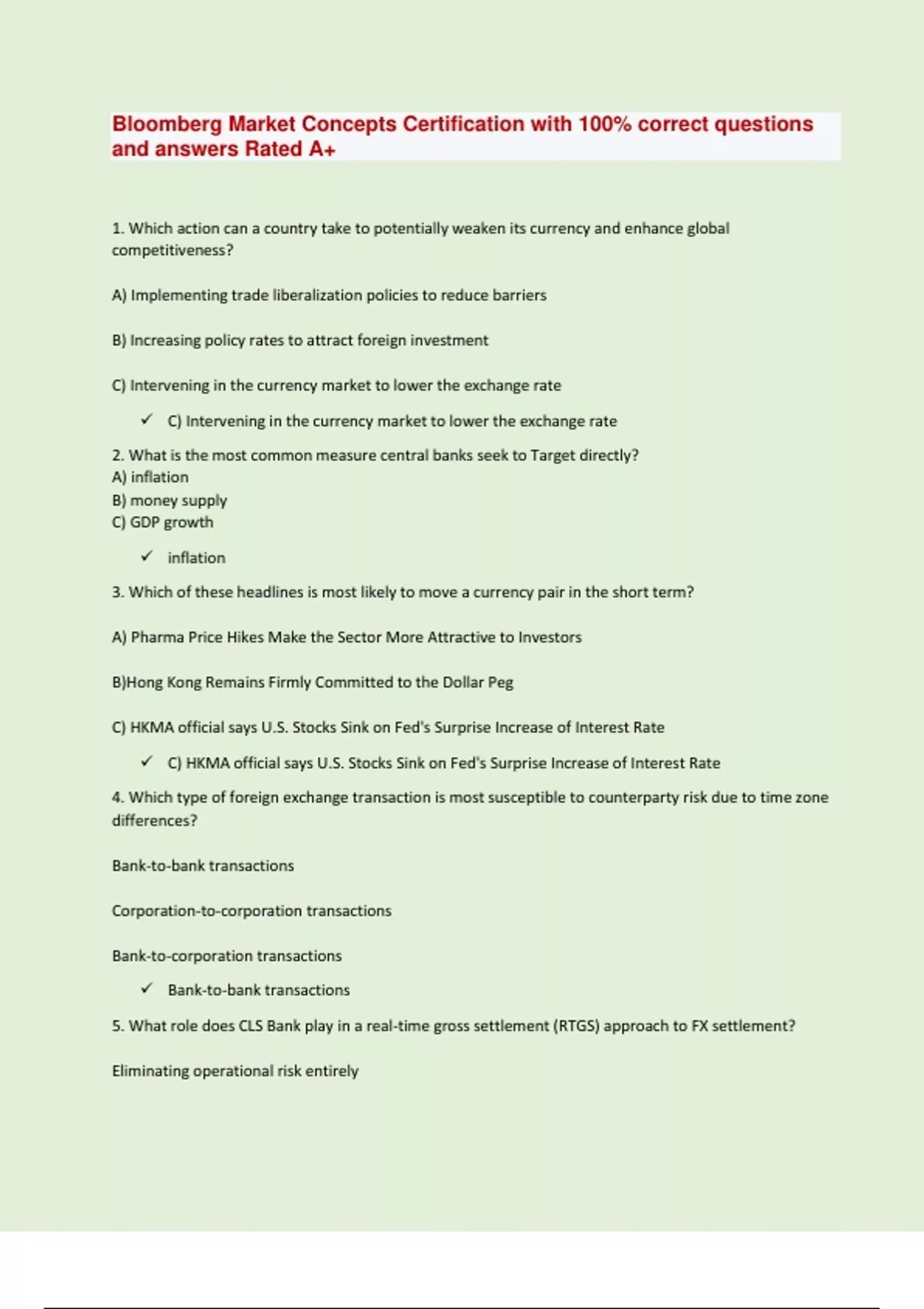 Bloomberg Market Concepts Certification with 100% correct questions and answers Rated A+
