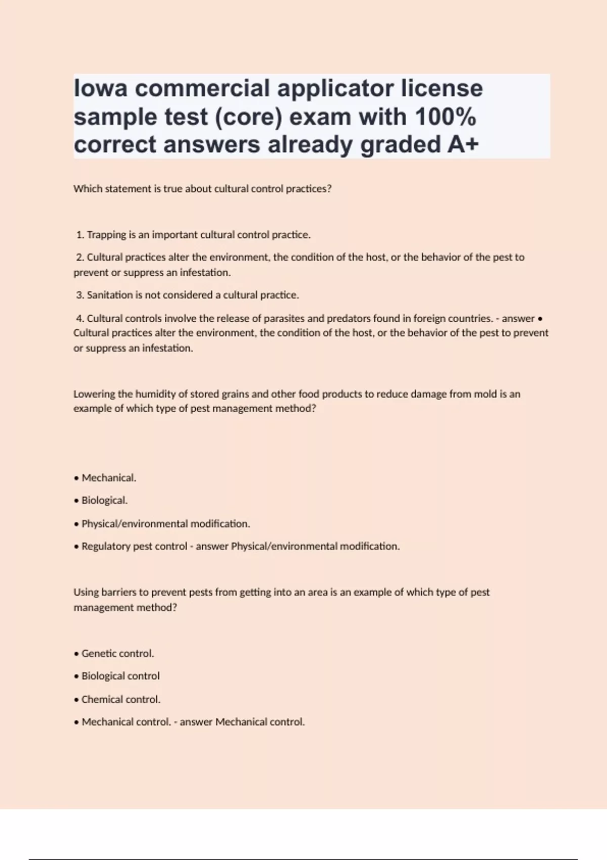 Iowa commercial applicator license sample test (core) exam with 100% correct answers