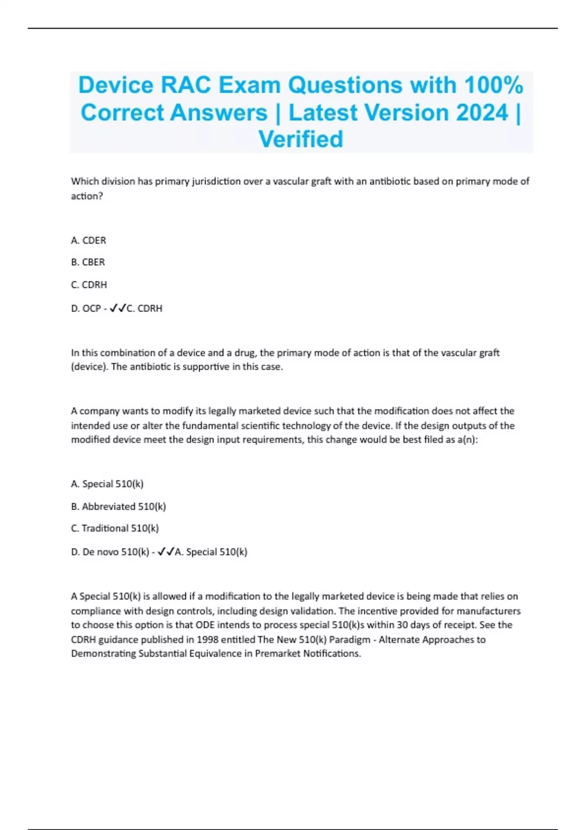 Which division has primary jurisdiction over a vascular graft with an antibiotic based on primary mode of action? A. CDER B. CBER C. CDRH D. OCP - C. CDRH In this combination of a device and a drug, the primary mode of action is that of the vascular graft (device). The antibiotic is supportive in this case. A company wants to modify its legally marketed device such that the modification does not affect the intended use or alter the fundamental scientific technology of the device. If the design outputs of the modified device meet the design input requirements, this change would be best filed as a(n): A. Special 510(k) B. Abbreviated 510(k) C. Traditional 510(k) D. De novo 510(k) - A. Special 510(k)