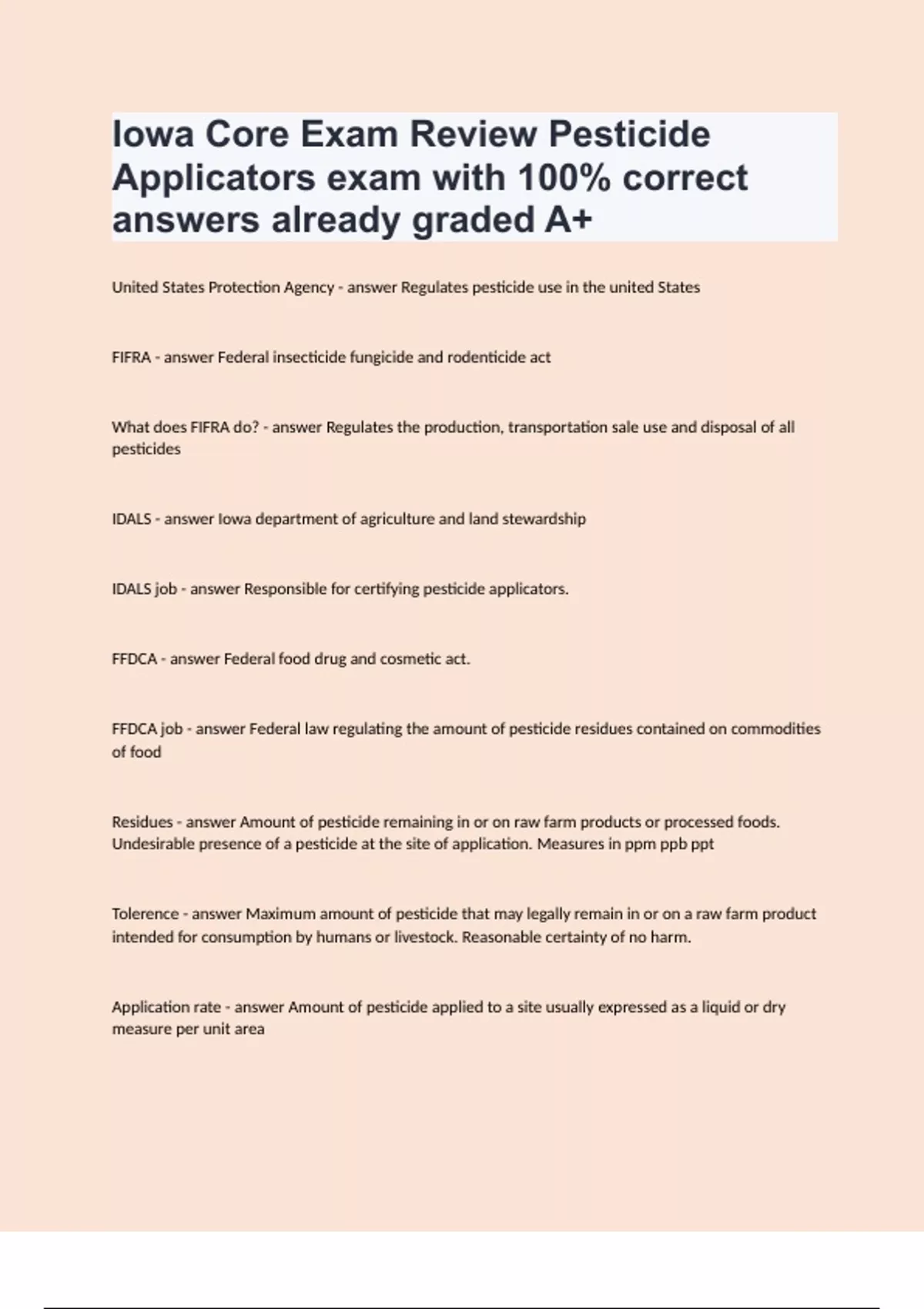 Iowa Core Exam Review Pesticide Applicators exam with 100% correct answers already graded A+.
