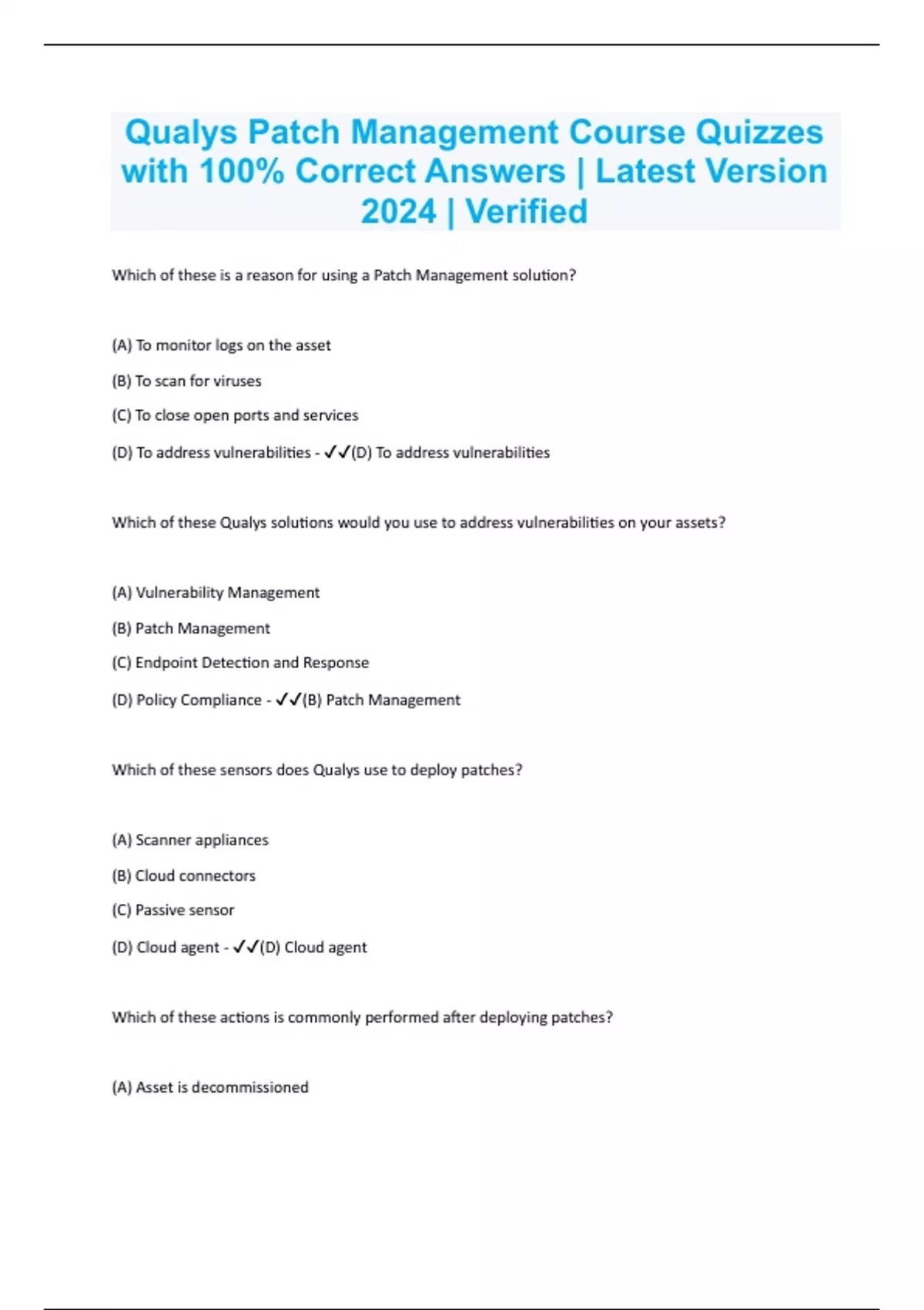 Qualys Patch Management Course Quizzes with 100% Correct Answers | Latest Version 2024 | Verified