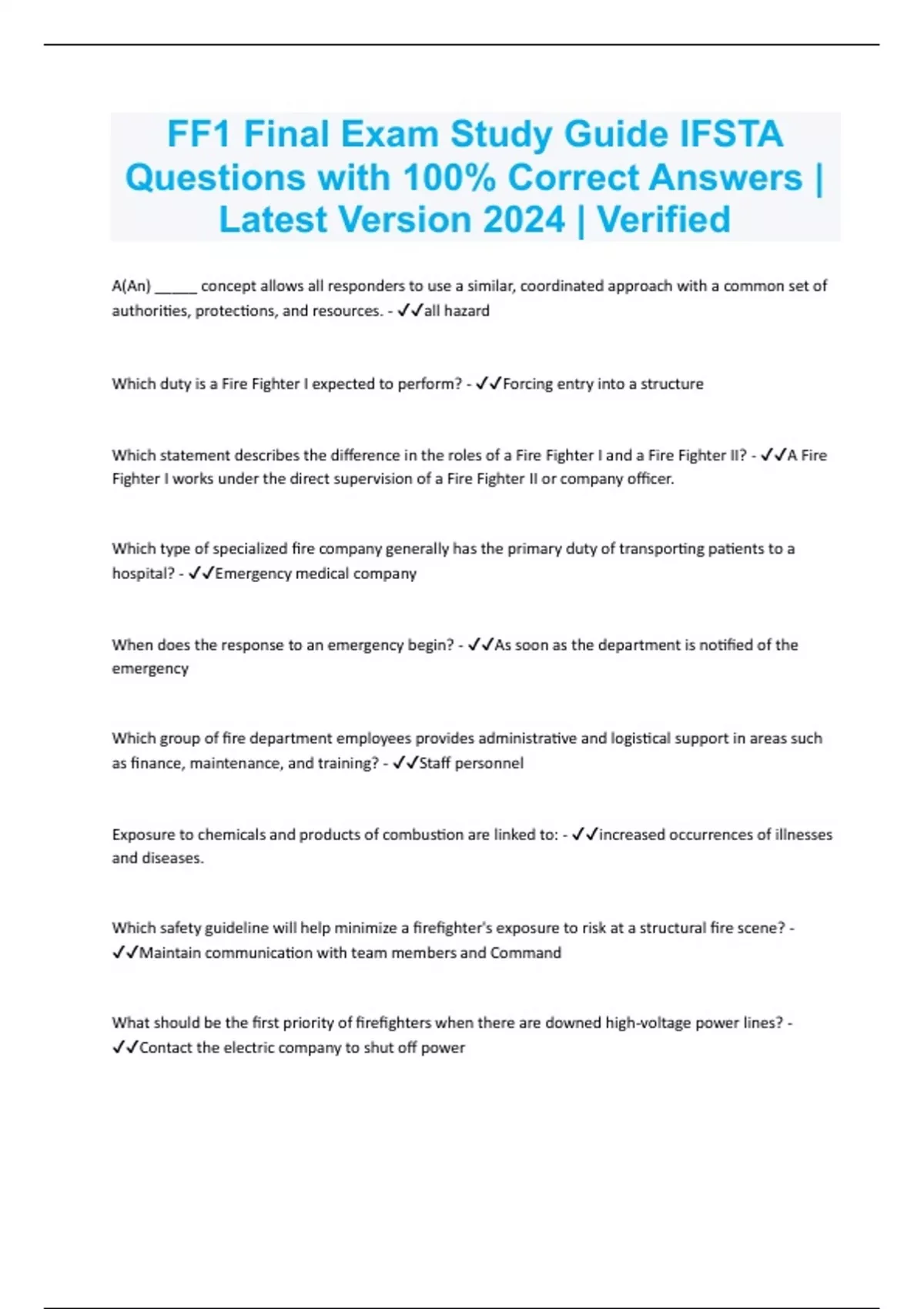 FF1 Final Exam Study Guide IFSTA Questions with 100% Correct Answers | Latest Version 2024 | Verified