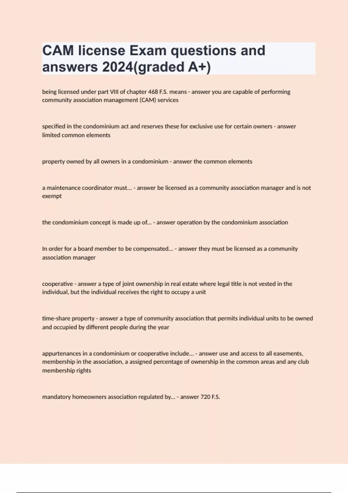 being licensed under part VIII of chapter 468 F.S. means you are capable of performing community association management (CAM) services specified in the condominium act and reserves these for exclusive use for certain owners limited common elements property owned by all owners in a condominium the common elements a maintenance coordinator must... be licensed as a community association manager and is not exempt the condominium concept is made up of... operation by the condominium association In order for a board member to be compensated... they must be licensed as a community association manager cooperative a type of joint ownership in real estate where legal title is not vested in the individual, but the individual receives the right to occupy a unit time-share property a type of community association that permits individual units to be owned and occupied by different people during the year appurtenances in a condominium or cooperative include... use and access to all easements, membership in the association, a assigned percentage of ownership in the common areas and any club membership rights mandatory homeowners association regulated by... 720 F.S. declaration a collection of documents that creates an elaborate set of covenants and restrictions that establish basic rights and responsibilities of residents and guests Bylaws required by the condominium act to establish the procedures for carrying out the day-to-day operations of the association condominium documents must be... recorded with the clerk of the circuit court as required by the condominium act part V of the condominium act gives the Division of Florida Land Sales, Condominiums, and Mobiles Homes the power to enforce and ensure compliance with the law when a rental property is converted into a condominium... each tenant has the right to extend the existing rental agreement amendments to the declaration become effective when... recorded with the clerk of the circuit court rules promulgated by the Florida Land Sales, Condominiums, and mobiles home are incorporated into the... administrative code (FAC) Fair Housing Act authority to make in unlawful to discriminate based on race, color, national origin, sex, handicap, religion or familial status exempt from prohibitions against discrimination based on familial status... a community will all residents age 62 or over employers that are required to comply with the provisions of the Americans with Disabilities act a business with 15 employees a contractor has replaced a roof on one of four buildings in a condominium and has not been paid... he may file a construction lien against all of the unit owners in the association in proportion to the amount of their ownership interests the easements and common elements of a condominium or cooperative are defined in the declaration the articles of incorporation of a community association... define the membership and voting rights of its members rules and regulations the informal or supplemental day-to-day guidelines governing the proper conduct of condominium residents articles of incorporation establishes the basic structure and areas of responsibility of a condominium association rules and regulations passed by the board... must be reasonable, non-discriminatory, and within the scope of their authority modifications in which the manner in which assessments are calculated... must be approved by all owners and lien holders in written joinder
