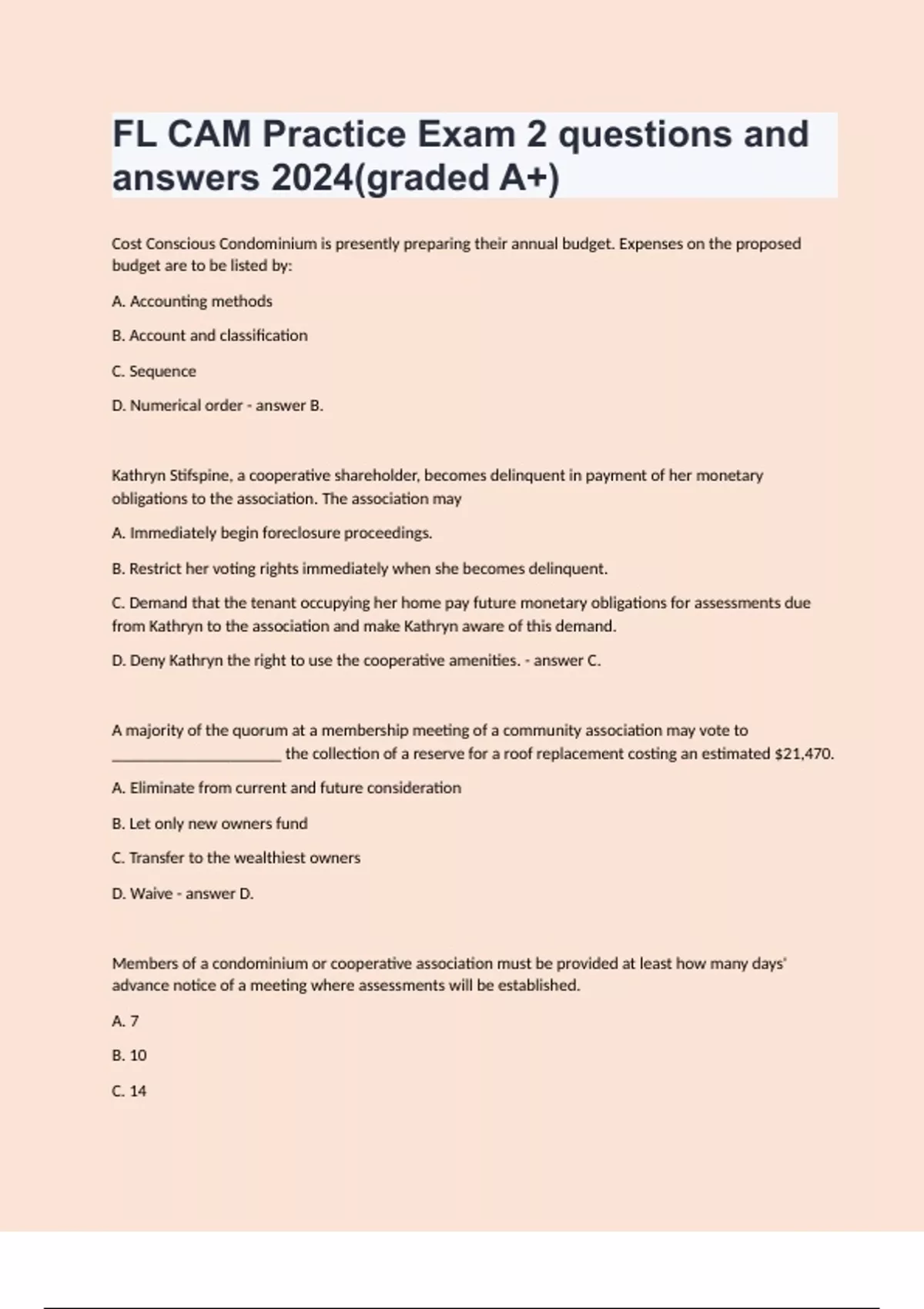 Cost Conscious Condominium is presently preparing their annual budget. Expenses on the proposed budget are to be listed by: A. Accounting methods B. Account and classification C. Sequence D. Numerical order B. Kathryn Stifspine, a cooperative shareholder, becomes delinquent in payment of her monetary obligations to the association. The association may A. Immediately begin foreclosure proceedings. B. Restrict her voting rights immediately when she becomes delinquent. C. Demand that the tenant occupying her home pay future monetary obligations for assessments due from Kathryn to the association and make Kathryn aware of this demand. D. Deny Kathryn the right to use the cooperative amenities. C. A majority of the quorum at a membership meeting of a community association may vote to ____________________ the collection of a reserve for a roof replacement costing an estimated $21,470. A. Eliminate from current and future consideration B. Let only new owners fund C. Transfer to the wealthiest owners D. Waive D. Members of a condominium or cooperative association must be provided at least how many days' advance notice of a meeting where assessments will be established. A. 7 B. 10 C. 14 D. 21 C. What percentage of the voting interest in a condominium association must petition the board to reconsider the newly adopted budget? A. 10% B. 15% C. 20% D. 25% A. Reserve funds when established and calculated using the separate or straight line method: A. May be used for recurring expenses. B. May be used for routine maintenance. C. May be used for anything but reserves. D. May be used only for the purpose for which they are collected unless otherwise approved by the membership. D. Before determining the individual cooperative assessments, sums generated by other revenue sources should be __________ by the board. A. Added B. Deducted C. Suspended D. Accrued B. There is no mention of the collection of assessments in the Highroller Cooperative documents. Florida law requires cooperative shareholders' owners assessments to be collected at least every: A. Month B. Three months C. Six months D. Year B. When Bob Bad-Credit's assessment becomes delinquent, the association may record a _________________ to protect its interest. A. Mortgage B. Declaration C. Claim of lien D. Charter C. Owner Sam Smith is considering selling his unit in the Lake Front Condominium. He makes a request to the board to verify all assessment amounts presently outstanding on his unit. Once received, the assessment certificate: A. May not be presumed to be accurate B. May be presumed to be accurate by a purchaser or a mortgage C. May be a source of controversy on the board D. May not be used by any person as a factual statement. B. Heavenly Rest Condominium Association has 80 units and receipts of $175,000 per year. Which of the following is correct? A. The association board must vote annually to decide what types of financials statements are required. B. The association must deliver audited financial statements. C. The association must comply with the special accounting requirements and provide compiled financial statements. D. Condominiums are not required to provide financial statements. C. Ms. Nocredit's community association assessment account is delinquent. The Florida Law-Abiding Homeowners' Association may file a claim of lien for the delinquent assessment after revising her with how many days' notice of intent to lien? A. 30 B. 25 C. 15 D. 45 D. Community associations having annual receipts of at least $300,000.00 but less than $500,000.00 must make available to unit owners which of the following types of financials statements unless waived? A. Reported B. Compiled C. Corrected and accurate D. Reviewed. D.