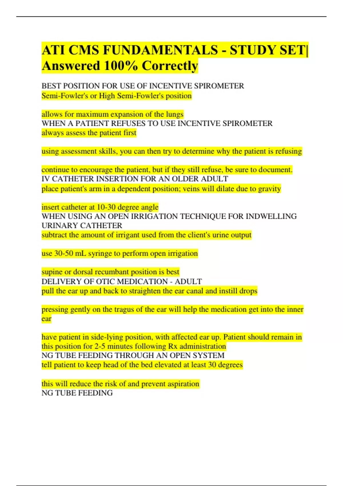 ATI CMS FUNDAMENTALS - STUDY SET| Answered 100% Correctly BEST POSITION FOR USE OF INCENTIVE SPIROMETER Semi-Fowler's or High Semi-Fowler's position allows for maximum expansion of the lungs WHEN A PATIENT REFUSES TO USE INCENTIVE SPIROMETER always assess the patient first using assessment skills, you can then try to determine why the patient is refusing continue to encourage the patient, but if they still refuse, be sure to document. IV CATHETER INSERTION FOR AN OLDER ADULT place patient's arm in a dependent position; veins will dilate due to gravity insert catheter at 10-30 degree angle WHEN USING AN OPEN IRRIGATION TECHNIQUE FOR INDWELLING URINARY CATHETER subtract the amount of irrigant used from the client's urine output use 30-50 mL syringe to perform open irrigation supine or dorsal recumbant position is best DELIVERY OF OTIC MEDICATION - ADULT pull the ear up and back to straighten the ear canal and instill drops pressing gently on the tragus of the ear will help the medication get into the inner ear have patient in side-lying position, with affected ear up. Patient should remain in this position for 2-5 minutes following Rx administration NG TUBE FEEDING THROUGH AN OPEN SYSTEM tell patient to keep head of the bed elevated at least 30 degrees this will reduce the risk of and prevent aspiration NG TUBE FEEDING