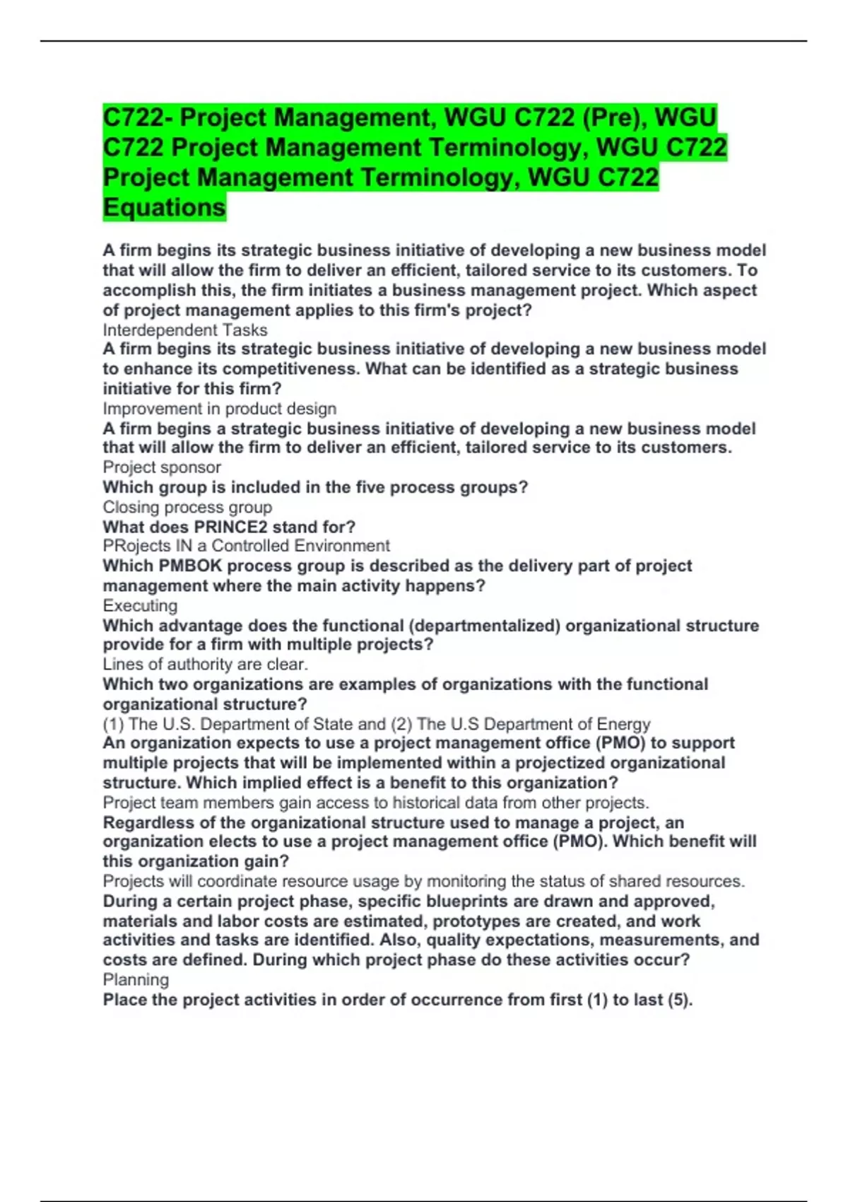 C722- Project Management, WGU C722 (Pre), WGU C722 Project Management Terminology, WGU C722 Project Management Terminology, WGU C722 Equations A firm begins its strategic business initiative of developing a new business model that will allow the firm to deliver an efficient, tailored service to its customers. To accomplish this, the firm initiates a business management project. Which aspect of project management applies to this firm's project? Interdependent Tasks A firm begins its strategic business initiative of developing a new business model to enhance its competitiveness. What can be identified as a strategic business initiative for this firm? Improvement in product design A firm begins a strategic business initiative of developing a new business model that will allow the firm to deliver an efficient, tailored service to its customers. Project sponsor Which group is included in the five process groups? Closing process group What does PRINCE2 stand for? PRojects IN a Controlled Environment Which PMBOK process group is described as the delivery part of project management where the main activity happens? Executing Which advantage does the functional (departmentalized) organizational structure provide for a firm with multiple projects? Lines of authority are clear. Which two organizations are examples of organizations with the functional organizational structure? (1) The U.S. Department of State and (2) The U.S Department of Energy An organization expects to use a project management office (PMO) to support multiple projects that will be implemented within a projectized organizational structure. Which implied effect is a benefit to this organization? Project team members gain access to historical data from other projects. Regardless of the organizational structure used to manage a project, an organization elects to use a project management office (PMO). Which benefit will this organization gain? Projects will coordinate resource usage by monitoring the status of shared resources. During a certain project phase, specific blueprints are drawn and approved, materials and labor costs are estimated, prototypes are created, and work activities and tasks are identified. Also, quality expectations, measurements, and costs are defined. During which project phase do these activities occur? Planning Place the project activities in order of occurrence from first (1) to last (5). (1) Collecting customer requirements (2) Developing the work breakdown structure (3) Working to produce project deliverables (4) Customers evaluating the project outcomes (5) Capturing lessons learned During which life cycle phase is the vast majority of the actual work to produce the project's deliverables completed? Executing What is the correct term for an intermediate outcome of project work, such as a signed contract or obtaining a construction permit? Deliverable Which deliverable from a work breakdown structure (WBS) is not specific enough to measure its completion at project closure? User training The following table shows the Level 1 work breakdown structure (WBS) for Project A. WBS ID Description 0.0 Project A 1.0 Project started 2.0 Feasiblity 3.0 Design 4.0 Development 5.0 Manufacturing 6.0 Distribution 7.0 Project completed Which approach did the project manager use to structure the WBS? Sequence of project phases For the following collapsed work breakdown structure (WBS) for Project O, the project manager must complete the scope baseline. In addition to the WBS, the scope baseline will contain two additional documents. WBS ID Description 0.0 Project O 1.0 Project started 2.0 Feasibility 3.0 Design 4.0 Development 5.0 Manufacturing 6.0 Distribution 7.0 Project completed What are the other two documents that belong in the scope baseline? WBS dictionary and project scope statement For the following collapsed work breakdown structure (WBS) for Project O, the project's steering committee held a phase gate review of the Feasibility results. That review determined that the project's proposed design would be obsolete before it would reach the marketplace. WBS ID Description 0.0 Project O 1.0 Project started 2.0 Feasibility 3.0 Design 4.0 Development 5.0 Manufacturing 6.0 Distribution 7.0 Project completed Which action should the project manager initiate? Terminating the project as soon as possible and releasing the project's resources A project is an operational necessity to repair a design flaw in the date field that constrains the year number to two digits, instead of permitting the year to be indicated with four digits. If the project is not completed before December 31, 1999, many legacy programs are expected to fail or produce unpredictable outcomes. The marketing department wants to upgrade its existing computer equipment and have the costs included in the budget for this project. The project team implemented the marketing department's request without completing the formal change control procedures. What has happened to the scope baseline in this scenario? Scope creep has caused a scope variance. A general contractor is managing a highway construction project that will repair a flood-damaged road. The project was documented in a cost-plus-incentive fee contract that specified a completion date of June 30. The Department of Transportation has offered an incentive for early completion of the repairs. Which triple-constraint baseline remains unchanged by the effects of the incentive? Scope In Project A, the contract specifies that time is very important. All of the scope must be completed, or the project will fail. The project's objective requires the project team to work as quickly as possible. Which triple constraint can be adjusted to permit the project team to work as quickly as possible? Cost In Project B, all of the scope must be completed, or the project will fail. The work is important but not urgent. Which triple constraint can be adjusted if the project's objective requires the project team to work at the 