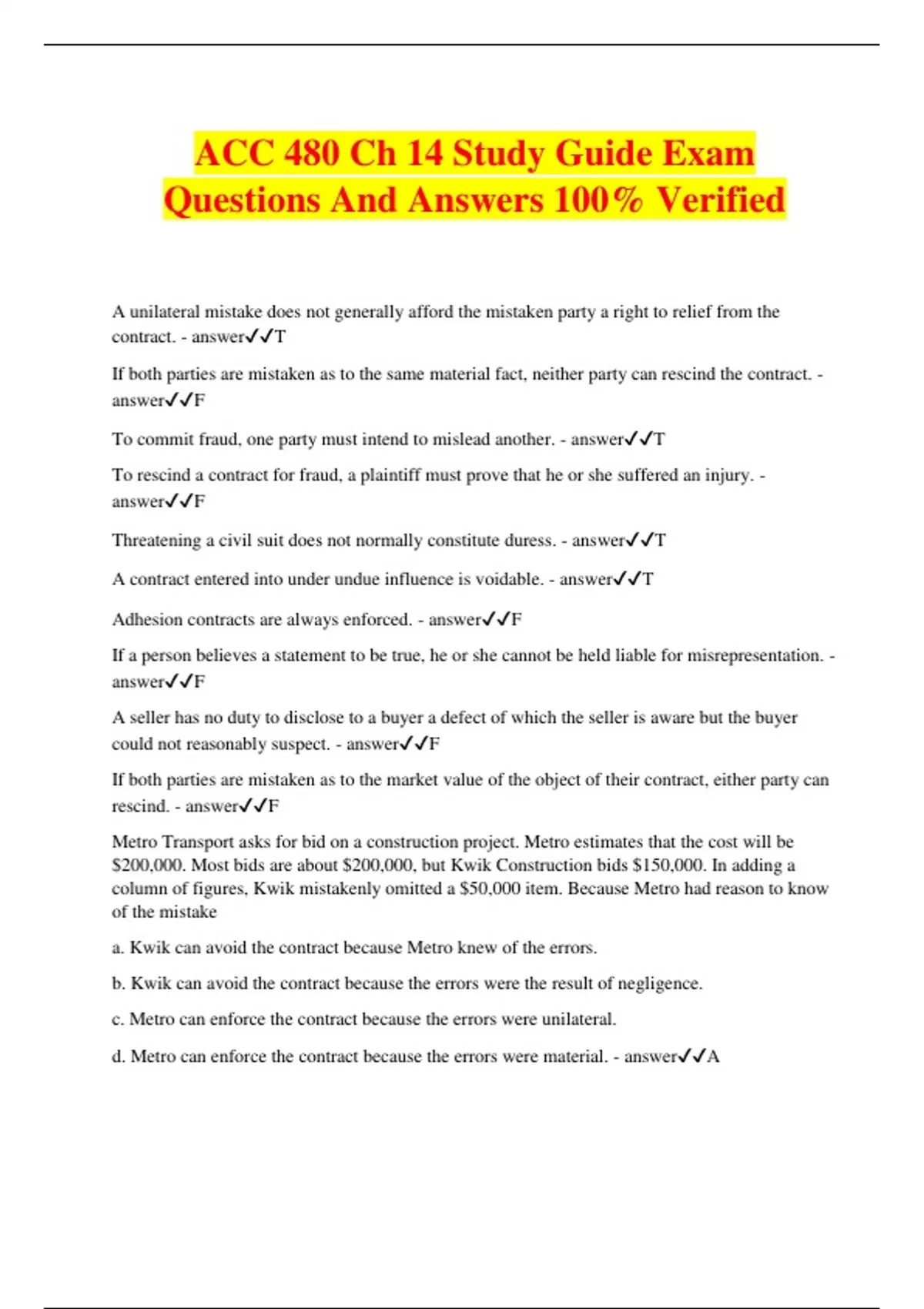 ACC 480 Ch 14 Study Guide Exam Questions And Answers 100% Verified A unilateral mistake does not generally afford the mistaken party a right to relief from the contract. - answerT If both parties are mistaken as to the same material fact, neither party can rescind the contract. - answerF To commit fraud, one party must intend to mislead another. - answerT To rescind a contract for fraud, a plaintiff must prove that he or she suffered an injury. - answerF Threatening a civil suit does not normally constitute duress. - answerT A contract entered into under undue influence is voidable. - answerT Adhesion contracts are always enforced. - answerF If a person believes a statement to be true, he or she cannot be held liable for misrepresentation. - answerF A seller has no duty to disclose to a buyer a defect of which the seller is aware but the buyer could not reasonably suspect. - answerF If both parties are mistaken as to the market value of the object of their contract, either party can rescind. - answerF Metro Transport asks for bid on a construction project. Metro estimates that the cost will be $200,000. Most bids are about $200,000, but Kwik Construction bids $150,000. In adding a column of figures, Kwik mistakenly omitted a $50,000 item. Because Metro had reason to know of the mistake a. Kwik can avoid the contract because Metro knew of the errors. b. Kwik can avoid the contract because the errors were the result of negligence. c. Metro can enforce the contract because the errors were unilateral. d. Metro can enforce the contract because the errors were material. - answerA