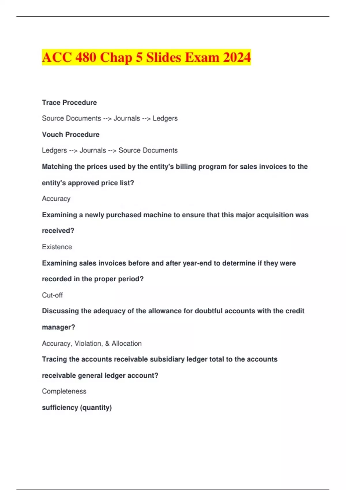 ACC 480 Chap 5 Slides Exam 2024 Trace Procedure Source Documents --> Journals --> Ledgers Vouch Procedure Ledgers --> Journals --> Source Documents Matching the prices used by the entity's billing program for sales invoices to the entity's approved price list? Accuracy Examining a newly purchased machine to ensure that this major acquisition was received? Existence Examining sales invoices before and after year-end to determine if they were recorded in the proper period? Cut-off Discussing the adequacy of the allowance for doubtful accounts with the credit manager? Accuracy, Violation, & Allocation Tracing the accounts receivable subsidiary ledger total to the accounts receivable general ledger account? Completeness sufficiency (quantity) inverse to other appropriateness (quality) relevance -> on point reliability -> got info directly? Test of Controls Looking for deficiencies Substantive Procedures the detailed audit and analytical proce