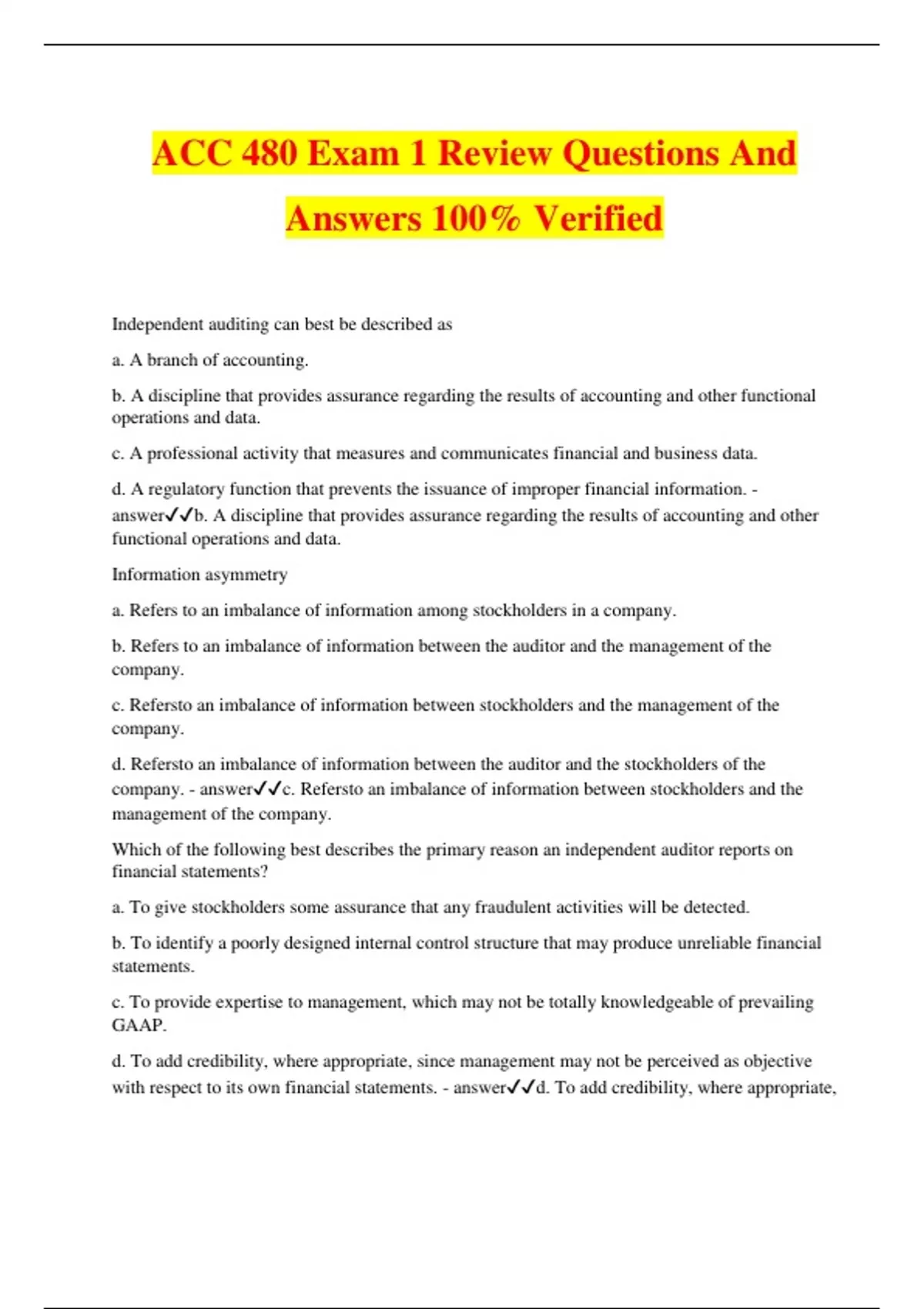 ACC 480 Exam 1 Review Questions And Answers 100% Verified Independent auditing can best be described as a. A branch of accounting. b. A discipline that provides assurance regarding the results of accounting and other functional operations and data. c. A professional activity that measures and communicates financial and business data. d. A regulatory function that prevents the issuance of improper financial information. - answerb. A discipline that provides assurance regarding the results of accounting and other functional operations and data. Information asymmetry a. Refers to an imbalance of information among stockholders in a company. b. Refers to an imbalance of information between the auditor and the management of the company. c. Refersto an imbalance of information between stockholders and the management of the company. d. Refersto an imbalance of information between the auditor and the stockholders of the company. - answerc. Refersto an imbalance of information between stockholders and the management of the company. Which of the following best describes the primary reason an independent auditor reports on financial statements? a. To give stockholders some assurance that any fraudulent activities will be detected. b. To identify a poorly designed internal control structure that may produce unreliable financial statements. c. To provide expertise to management, which may not be totally knowledgeable of prevailing GAAP. d. To add credibility, where appropriate, since management may not be perceived as objective with respect to its own financial statements. - answerd. To add credibility, where appropriate, since management may not be perceived as objective with respect to its own financial statements. Financial statement users' demand for assurance is similar to that of a potential home buyer who hires a home inspector in that a. The buyer [or user] pays directly for this assurance in both situations. b. There are often information asymmetry and conflicts of interest. c. The cost of obtaining information is not relevant. d. Independence is not relevant in either situation. - answerb. There are often information asymmetry and conflicts of interest. Assurance services differ from auditing services in that a. Assurance services are more narrow in scope than audit services. b. Assurance services may include a report about the relevance and timeliness, not just the reliability, of the information. c. Assurance services are limited to economic events or actions, and audit services are not similarly limited. d. Audit services do not improve the quality of information as do assurance services. - answerb. Assurance services may include a report about the relevance and timeliness, not just the reliability, of the information. Which of the following best describes the relationship between attestation services and audit services? a. Attestation is a subset of auditing that improvesthe quality of information for decision makers. b. Auditing is a subset of attestation and focuses on providing companies with advisory services and decision support. c. Auditing is a subset of attestation that involves the issuance of an opinion regarding the fairness of financial statements. d. Attestation is a subset of auditing that provides more assurance than does an audit engagement. - answerc. Auditing is a subset of attestation that involves the issuance of an opinion regarding the fairness of financial statements. The fact that errors and/or omissions in certain relatively insignificant account balances would not affect an auditor's decision when reporting on the financial statements as a whole relates most closely to which major audit concept? a. Materiality. b. Audit risk. c. Management assertions. d. Reasonable assurance. - answera. Materiality. Audit evidence a. May only be gathered from parti