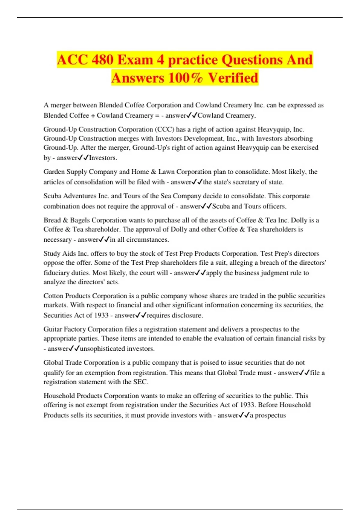 ACC 480 Exam 4 practice Questions And Answers 100% Verified A merger between Blended Coffee Corporation and Cowland Creamery Inc. can be expressed as Blended Coffee + Cowland Creamery = - answerCowland Creamery. Ground-Up Construction Corporation (CCC) has a right of action against Heavyquip, Inc. Ground-Up Construction merges with Investors Development, Inc., with Investors absorbing Ground-Up. After the merger, Ground-Up's right of action against Heavyquip can be exercised by - answerInvestors. Garden Supply Company and Home & Lawn Corporation plan to consolidate. Most likely, the articles of consolidation will be filed with - answerthe state's secretary of state. Scuba Adventures Inc. and Tours of the Sea Company decide to consolidate. This corporate combination does not require the approval of - answerScuba and Tours officers. Bread & Bagels Corporation wants to purchase all of the assets of Coffee & Tea Inc. Dolly is a Coffee & Tea shareholder. The approval of Dolly and other Coffee & Tea shareholders is necessary - answerin all circumstances. Study Aids Inc. offers to buy the stock of Test Prep Products Corporation. Test Prep's directors oppose the offer. Some of the Test Prep shareholders file a suit, alleging a breach of the directors' fiduciary duties. Most likely, the court will - answerapply the business judgment rule to analyze the directors' acts. Cotton Products Corporation is a public company whose shares are traded in the public securities markets. With respect to financial and other significant information concerning its securities, the Securities Act of 1933 - answerrequires disclosure. Guitar Factory Corporation files a registration statement and delivers a prospectus to the appropriate parties. These items are intended to enable the evaluation of certain financial risks by - answerunsophisticated investors. Global Trade Corporation is a public company that is poised to issue securities that do not qualify for an exemption from registration. This means that Global Trade must - answerfile a registration statement with the SEC. Household Products Corporation wants to make an offering of securities to the public. This offering is not exempt from registration under the Securities Act of 1933. Before Household Products sells its securities, it must provide investors with - answera prospectus As part of a stock offering for Designer Studio Corporation, the firm's accountant Evelyn intentionally misrepresents material facts in the prospectus. Flores buys the stock unaware of the misrepresentation and suffers a loss. Evelyn may be subject to - answera fine, imprisonment, and damages. Space Trips Inc. files a registration statement with the SEC before making an offering to the general public. The registration contains false, immaterial statements of which the investors are unaware. Space Trips is charged with violating the Securities Act of 1933. Space Trips's best defense is - answerthe untrue statements were not material. Dhani, an accountant for Eureka! Inc. learns of undisclosed company plans to market a new laptop. Dhani buys 1,000 shares of Eureka stock. He reveals the company plans to Fay, who tells Geoff. Both Fay and Geoff buy 100 shares. Geoff knows that Fay got her information from Dhani. When Eureka! publicly announces its new laptop, Dhani, Fay, and Geoff sell their stock for a profit. Under the Securities Exchange Act of 1934, Fay is most likely - answerliable for insider trading. Dhani, an accountant for Eureka! Inc. learns of undisclosed company plans to market a new laptop. Dhani buys 1,000 shares of Eureka stock. He reveals the company plans to Fay, who tells Geoff. Both Fay and Geoff buy 100 shares. Geoff knows that Fay got her information from Dhani. When Eureka! publicly announces its new laptop, Dhani, Fay, and Geoff sell their stock for a profit. Under the Securities Exchange Act of 1934, Geoff is most likely - answerliable for insider trading. Boats & Yachts Corporation is a public company, which California regulates and in which Dorian invests. The Sarbanes-Oxley Act of 2002 introduced direct federal corporate governance requirements to - answerpublic companies. Rollo is the chief executive officer of Specialty Magazines, Inc., which is required to file certain financial reports with the Securities and Exchange Commission (SEC). Under the Sarbanes- Oxley Act of 2002, Rollo must - answercertify that the reports are complete and accurate. Coco is considering forms of business organization for her concessions business—Coco's Cakes. Most states require that a limited liability company have - answerat least one member. Otto is considering forms of business organization for Pro Tree Service, his landscaping firm. Like most states, Otto's state requires that to form a limited liability company, he must file with a central state agency - answerarticles of organization