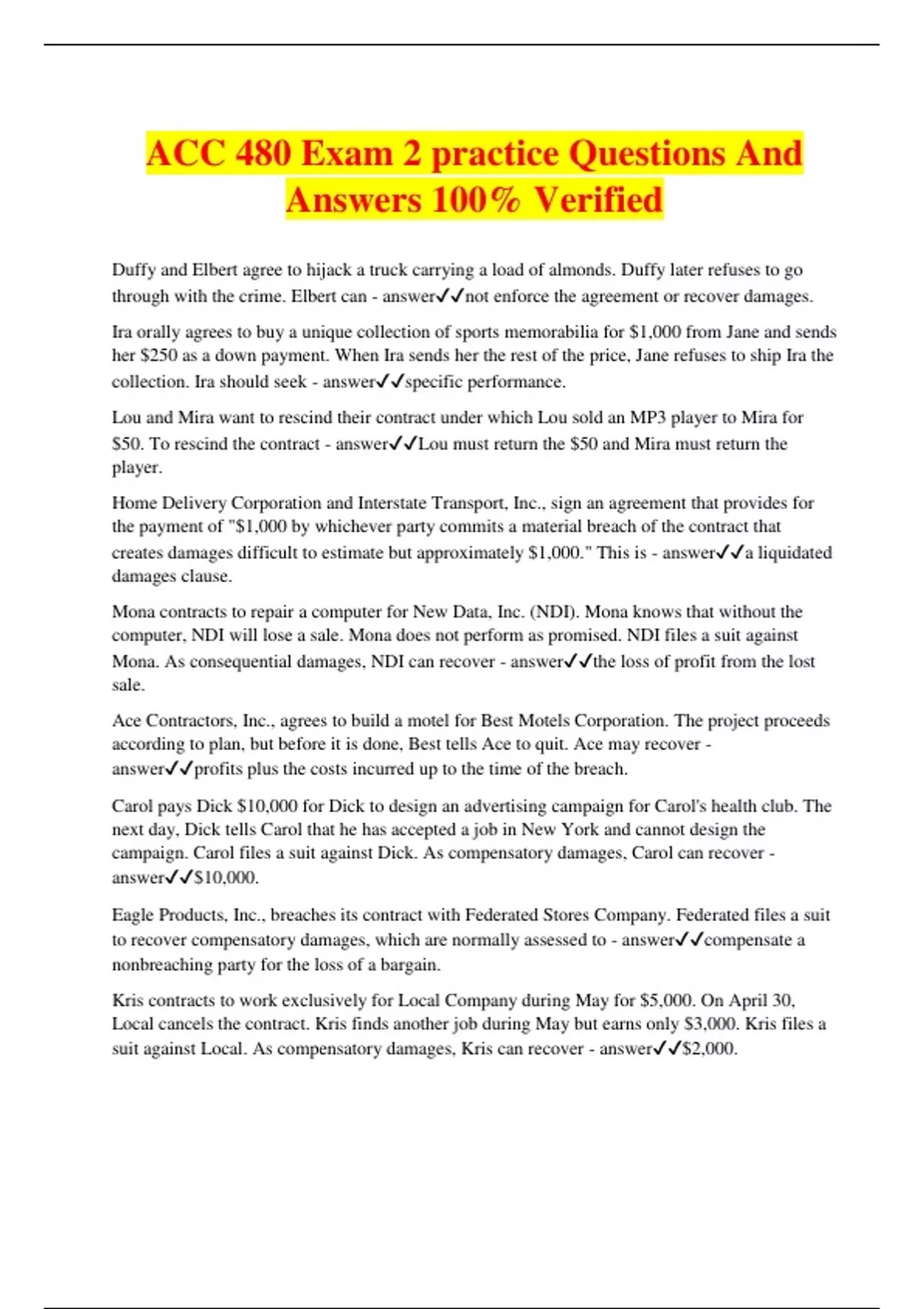 ACC 480 Exam 2 practice Questions And Answers 100% Verified Duffy and Elbert agree to hijack a truck carrying a load of almonds. Duffy later refuses to go through with the crime. Elbert can - answernot enforce the agreement or recover damages. Ira orally agrees to buy a unique collection of sports memorabilia for $1,000 from Jane and sends her $250 as a down payment. When Ira sends her the rest of the price, Jane refuses to ship Ira the collection. Ira should seek - answerspecific performance. Lou and Mira want to rescind their contract under which Lou sold an MP3 player to Mira for $50. To rescind the contract - answerLou must return the $50 and Mira must return the player. Home Delivery Corporation and Interstate Transport, Inc., sign an agreement that provides for the payment of "$1,000 by whichever party commits a material breach of the contract that creates damages difficult to estimate but approximately $1,000." This is - answera liquidated damages clause. Mona contracts to repair a computer for New Data, Inc. (NDI). Mona knows that without the computer, NDI will lose a sale. Mona does not perform as promised. NDI files a suit against Mona. As consequential damages, NDI can recover - answerthe loss of profit from the lost sale. Ace Contractors, Inc., agrees to build a motel for Best Motels Corporation. The project proceeds according to plan, but before it is done, Best tells Ace to quit. Ace may recover - answerprofits plus the costs incurred up to the time of the breach. Carol pays Dick $10,000 for Dick to design an advertising campaign for Carol's health club. The next day, Dick tells Carol that he has accepted a job in New York and cannot design the campaign. Carol files a suit against Dick. As compensatory damages, Carol can recover - answer$10,000. Eagle Products, Inc., breaches its contract with Federated Stores Company. Federated files a suit to recover compensatory damages, which are normally assessed to - answercompensate a nonbreaching party for the loss of a bargain. Kris contracts to work exclusively for Local Company during May for $5,000. On April 30, Local cancels the contract. Kris finds another job during May but earns only $3,000. Kris files a suit against Local. As compensatory damages, Kris can recover - answer$2,000.