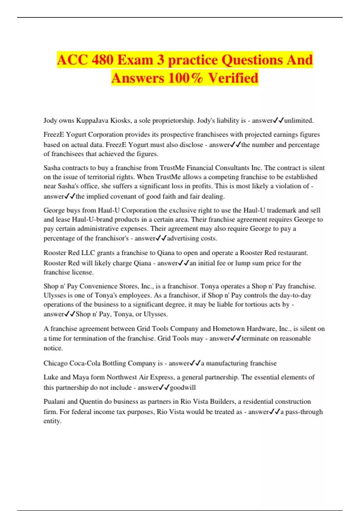 ACC 480 Exam 3 practice Questions And Answers 100% Verified Jody owns KuppaJava Kiosks, a sole proprietorship. Jody's liability is - answerunlimited. FreezE Yogurt Corporation provides its prospective franchisees with projected earnings figures based on actual data. FreezE Yogurt must also disclose - answerthe number and percentage of franchisees that achieved the figures. Sasha contracts to buy a franchise from TrustMe Financial Consultants Inc. The contract is silent on the issue of territorial rights. When TrustMe allows a competing franchise to be established near Sasha's office, she suffers a significant loss in profits. This is most likely a violation of - answerthe implied covenant of good faith and fair dealing. George buys from Haul-U Corporation the exclusive right to use the Haul-U trademark and sell and lease Haul-U-brand products in a certain area. Their franchise agreement requires George to pay certain administrative expenses. Their agreement may also require George to pay a percentage of the franchisor's - answeradvertising costs. Rooster Red LLC grants a franchise to Qiana to open and operate a Rooster Red restaurant. Rooster Red will likely charge Qiana - answeran initial fee or lump sum price for the franchise license. Shop n' Pay Convenience Stores, Inc., is a franchisor. Tonya operates a Shop n' Pay franchise. Ulysses is one of Tonya's employees. As a franchisor, if Shop n' Pay controls the day-to-day operations of the business to a significant degree, it may be liable for tortious acts by - answerShop n' Pay, Tonya, or Ulysses. A franchise agreement between Grid Tools Company and Hometown Hardware, Inc., is silent on a time for termination of the franchise. Grid Tools may - answerterminate on reasonable notice. Chicago Coca-Cola Bottling Company is - answera manufacturing franchise Luke and Maya form Northwest Air Express, a general partnership. The essential elements of this partnership do not include - answergoodwill Pualani and Quentin do business as partners in Rio Vista Builders, a residential construction firm. For federal income tax purposes, Rio Vista would be treated as - answera pass-through entity. Quisa and Reilly are partners in Sport Bikes, which rents and sells bikes, bike accessories, and related gear. Quisa manages the business. Unless the partnership agreement states otherwise, Quisa is - answernot entitled to compensation. Edgar, Jon, and Phoebe do business as Reliable Movers. Phoebe develops a debilitating illness and can no longer work. Phoebe - answermay dissociate from the partnership. Sabin and Tyler agree while talking on the phone to form a partnership. Their partnership agreement is legally binding - answerwithout more. Dean starts up E-Sites, an Internet service, and leases office space in a building owned by Fred. The lease requires Dean to pay Fred a base rental of $250, plus 10 percent of E-Sites' profits, each month. The term is two years. Dean hires Gina to work at E-Sites' tech support desk at an hourly wage of $9.00, plus a commission of 10 percent of the profits. The term is also two years. Dean and Fred are - answernot partners, because Fred does not have an ownership interest or management rights in E-Sites. Dean starts up E-Sites, an Internet service, and leases office space in a building owned by Fred. The lease requires Dean to pay Fred a base rental of $250, plus 10 percent of E-Sites' profits, each month. The term is two years. Dean hires Gina to work at E-Sites' tech support desk at an hourly wage of $9.00, plus a commission of 10 percent of the profits. The term is also two years. Dean and Gina are - answernot partners, because Gina does not have an ownership interest or management rights in E-Sites. Mabel and Nicole do business as One World Realty. In acting on the firm's behalf in a deal with Property Acquisition Company, Mabel fails to turn in the profit. To her firm, Mabel is - answerliable for breach of the duty of loyalty. Nazih and Ovidia are limited partners in Physicians Medical Center, a limited partnership. In terms of the firm's books and information regarding partnership business, Nazih and Ovidia are entitled to - answercomplete access. Kelly, Lars, and Mona agree to be partners in Neighborhood Delivery Service (NDS), splitting the profits equally. Kelly contributes 67 percent of the capital. When NDS is dissolved, its liabilities are greater than its assets. The losses are paid by - answerall of the partners in proportion to their shares of the profits. Lucy is a limited partner in Metro Contractors, a limited partnership, which cannot pay its debts. Lucy is personally liable for the debts - answerto the extent of her capital contribution.