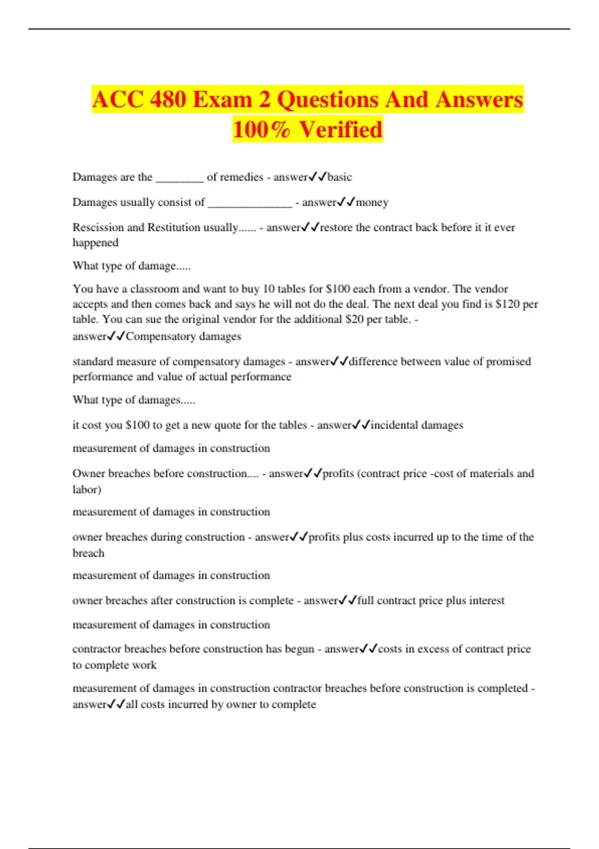 ACC 480 Exam 2 Questions And Answers 100% Verified Damages are the ________ of remedies - answerbasic Damages usually consist of ______________ - answermoney Rescission and Restitution usually...... - answerrestore the contract back before it it ever happened What type of damage..... You have a classroom and want to buy 10 tables for $100 each from a vendor. The vendor accepts and then comes back and says he will not do the deal. The next deal you find is $120 per table. You can sue the original vendor for the additional $20 per table. - answerCompensatory damages standard measure of compensatory damages - answerdifference between value of promised performance and value of actual performance What type of damages..... it cost you $100 to get a new quote for the tables - answerincidental damages measurement of damages in construction Owner breaches before construction.... - answerprofits (contract price -cost of materials and labor) measurement of damages in construction owner breaches during construction - answerprofits plus costs incurred up to the time of the breach measurement of damages in construction owner breaches after construction is complete - answerfull contract price plus interest measurement of damages in construction contractor breaches before construction has begun - answercosts in excess of contract price to complete work measurement of damages in construction contractor breaches before construction is completed - answerall costs incurred by owner to complete common remedies to a contract breach - answerDamages Rescission and Restitution Specific Performance Reformation Recovery Based on Quasi Contract Consequential damages are _____________ losses - answerforeseeable Consequential damages - answerbreaching party is aware causing the injury party additional loss What type of damages? you decide to build a toy store. Your contract says you can open November 1st. Reasonable time was given to the contractor to build and he drags his feet around during construction. He says you will not be able to open until the following January 1st. You will miss opening for the holidays and all the profits you could have made. You can sue for the missed sales due to the delaying of opening. - answerconsequential damages What type of damages? what can you sue for? you decide to build a toy store. Your contract says you can open November 1st. Reasonable time was given to the contractor to build and he drags his feet around during construction. He says you will not be able to open until the following January 1st. You will miss opening for the holidays and all the profits you could have made. - answerconsequential damages You can sue for the missed sales due to the delaying of opening. punitive damages - answerpunish or deter future conduct. usually tort is involved what type of damages will occur? : After Katrina, when people called state farm insurance to assess their damages, they refused to come. Instead, they deemed the damages by water, not wind, and did not look at the damages. They did not pay people for their damages. The courts will tact on an additional payment state farm has to pay in addition to what they owe them as well. - answerpunitive damages "don't do that again, shame on you" damages - answerpunitive damages nominal damages - answerno financial loss. Usually just to prove a point like "I was right" what type of damages "I was right, you were wrong" - answernominal