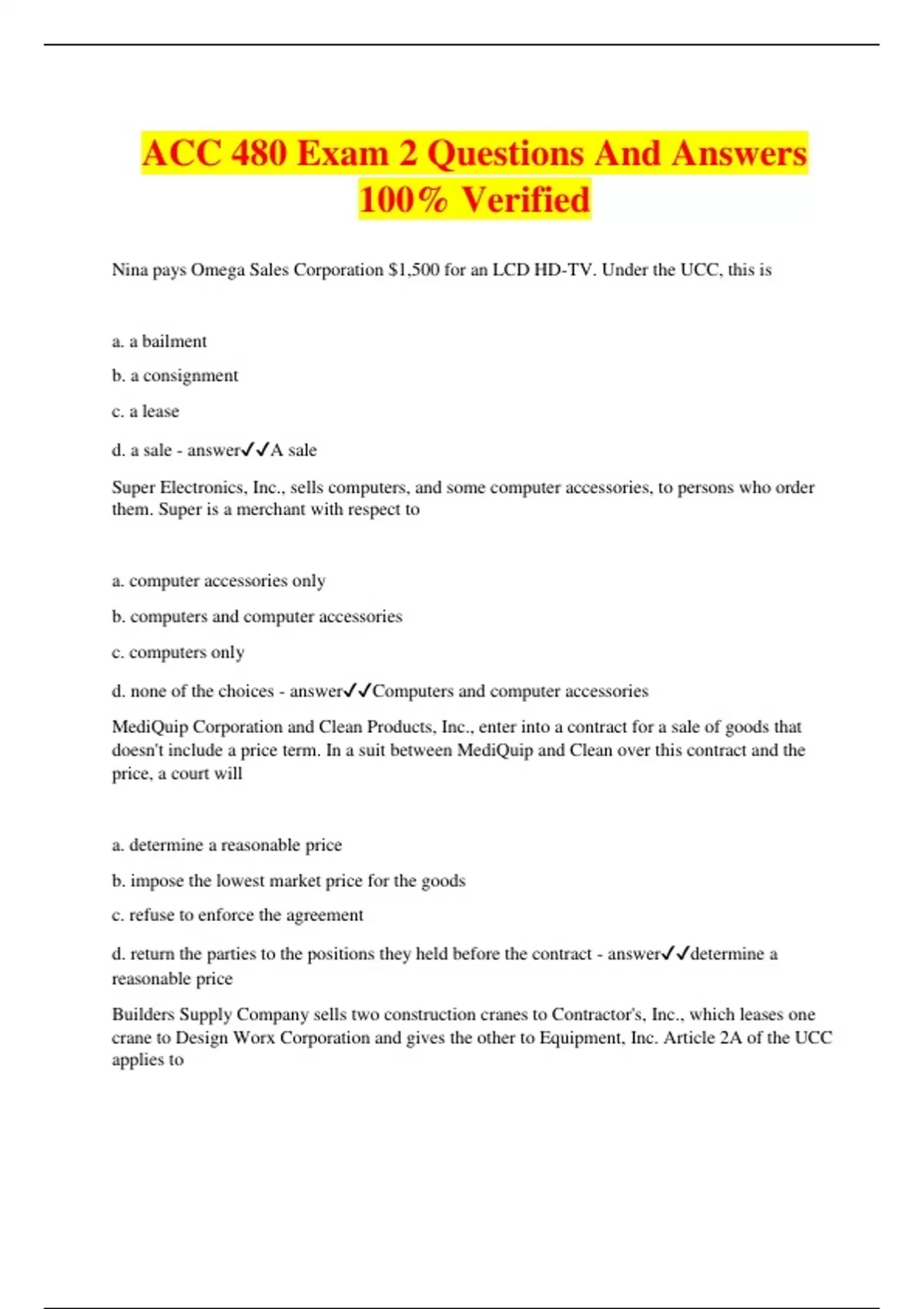 ACC 480 Exam 2 Questions And Answers 100% Verified Nina pays Omega Sales Corporation $1,500 for an LCD HD-TV. Under the UCC, this is a. a bailment b. a consignment c. a lease d. a sale - answerA sale Super Electronics, Inc., sells computers, and some computer accessories, to persons who order them. Super is a merchant with respect to a. computer accessories only b. computers and computer accessories c. computers only d. none of the choices - answerComputers and computer accessories MediQuip Corporation and Clean Products, Inc., enter into a contract for a sale of goods that doesn't include a price term. In a suit between MediQuip and Clean over this contract and the price, a court will a. determine a reasonable price b. impose the lowest market price for the goods c. refuse to enforce the agreement d. return the parties to the positions they held before the contract - answerdetermine a reasonable price Builders Supply Company sells two construction cranes to Contractor's, Inc., which leases one crane to Design Worx Corporation and gives the other to Equipment, Inc. Article 2A of the UCC applies to a. the gift. b. the lease. c. the sale. d. the gift, the lease, and the sale. - answerthe lease only Regal Boots Inc., and Star Shoe Company orally agree to a sale of 100 pair of hiking boots for $5,000. Regal gives Star a check for $500 a down payment. At this point, the contract is a. enforceable to at least the extent of $500 b. fully enforceable because it is for specially made goods c. fully enforceable because it is oral d. unenforceable - answerenforceable to at least the extent of $500 Mall Stores Corporation sends its purchase order form to Neat Displays, Inc. for shelving. Neat responds with its own form. Additional terms in Neat's form automatically become part of the parties' contract a. under any circumstances b. under no circumstances c. unless Mall objects to the new terms within a reasonable period of time d. unless Neat indicates otherwise before shipping the goods - answerunless Mall objects to the new term within a reasonable period of time Gia and Hugh dispute the interpretation of an ambiguous clause in their contract. In a suit to determine the meaning of the clause, the court may accept evidence of a. consistent additional terms only b. consistent additional terms and contradictory terms c. contradictory terms only d. anything extrinsic to the contract - answerconsistent to additional terms only Eagle Products, Inc., assures Fine Retail Corporation that its offer to sell its products at a certain price will remain open. This is a firm offer only if a. Fine (the offeree) gives consideration for the offer b. Fine (the offeror) is a merchant c. the offer is made by Eagle (a merchant) in a signed writing d. the offer states the time period during which it will remain open - answerthe offer is made by Eagle (a merchant) in a signed writing Kelly enters a contract with Liberty Appliances, Inc. In a later suit, Kelly claims that a clause in the contract is unconscionable. If the court agrees, it may a. enforce, limit, or refuse to enforce the contract or the disputed clause. b. enforce the contract without the disputed clause only. c. limit the application of the disputed clause only. d. refuse to enforce the contract only. - answerenforce, limit, or refuse to enforce the contract or the disputed clause Mac's Service Station agrees to buy an unspecified quantity of ethanol from NuFuel Corporation. NuFuel breaches the contract. Mac's can most likely a. enforce the agreement to the amount of a reasonable quantity. b. enforce the agreement to the amount of Mac's requirements for ethanol. c. enforce the agreement to the amount of NuFuel's output of ethanol. d. not enforce the agreement. - answernot enforce the agreement Starbucks and XYZ would have an enforceable contract even if they did not state in writing a. the amount of coffee ordered b. the price of the coffee c. both a and b d. none of the above - answerthe price of the coffee If Starbucks and XYZ did not include a "DESCRIPTION" of the coffee as "high grown Mexican Altura", then the delivered coffee must meet a. Starbucks subjective expectations of their quality